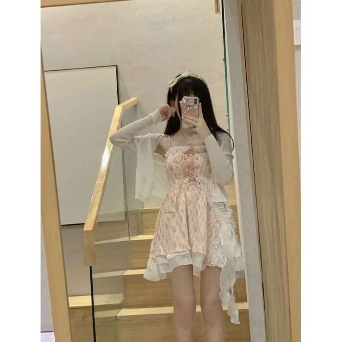 年齢を減らす遊び心のある花柄スリングドレス女性の夏の 2023 新しいウエスト痩身甘いネクタイシックなスカート 大人ガーリー スウィート キュート カジュアル サマー 夏物 0921970369418384
