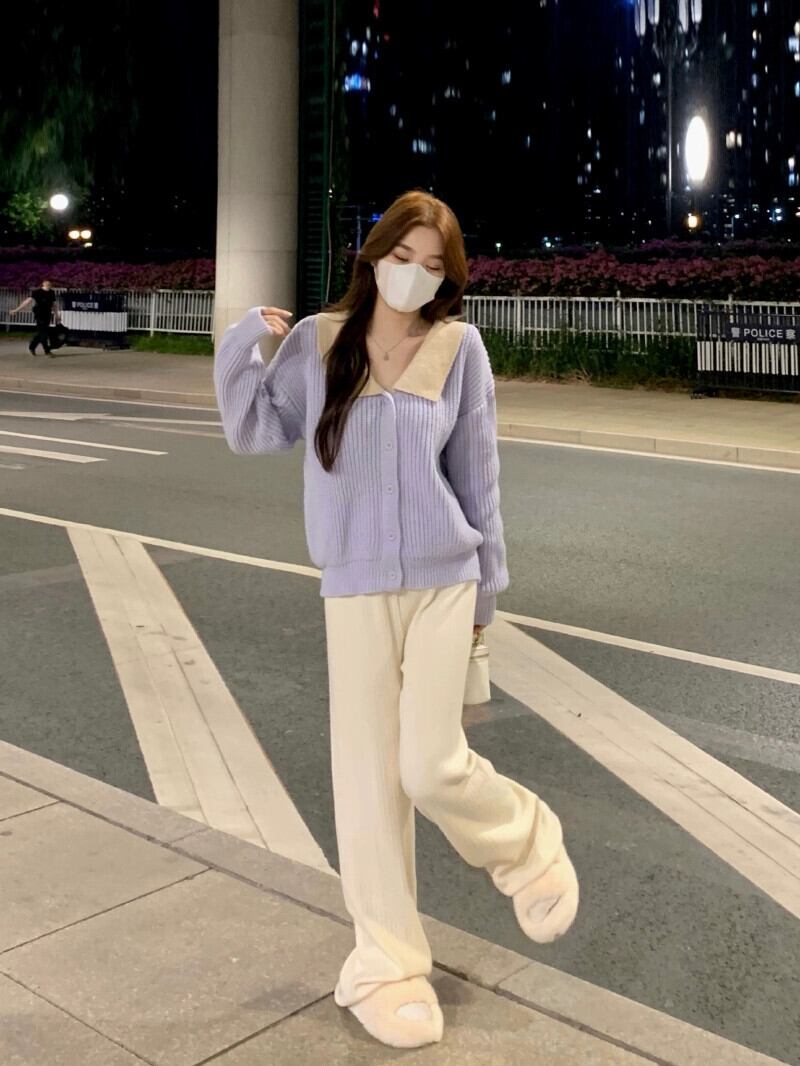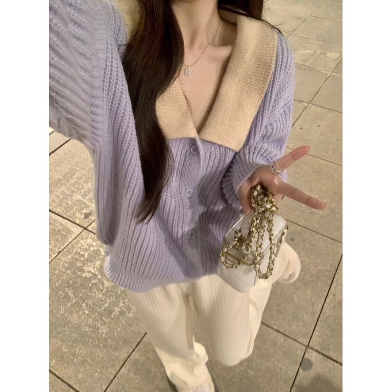優しい風ポロカラー紫のルーズセータージャケット女性の春の 2023 新作ニットカーディガントップ潮 スプリング 春物 パープル 0921998357540770