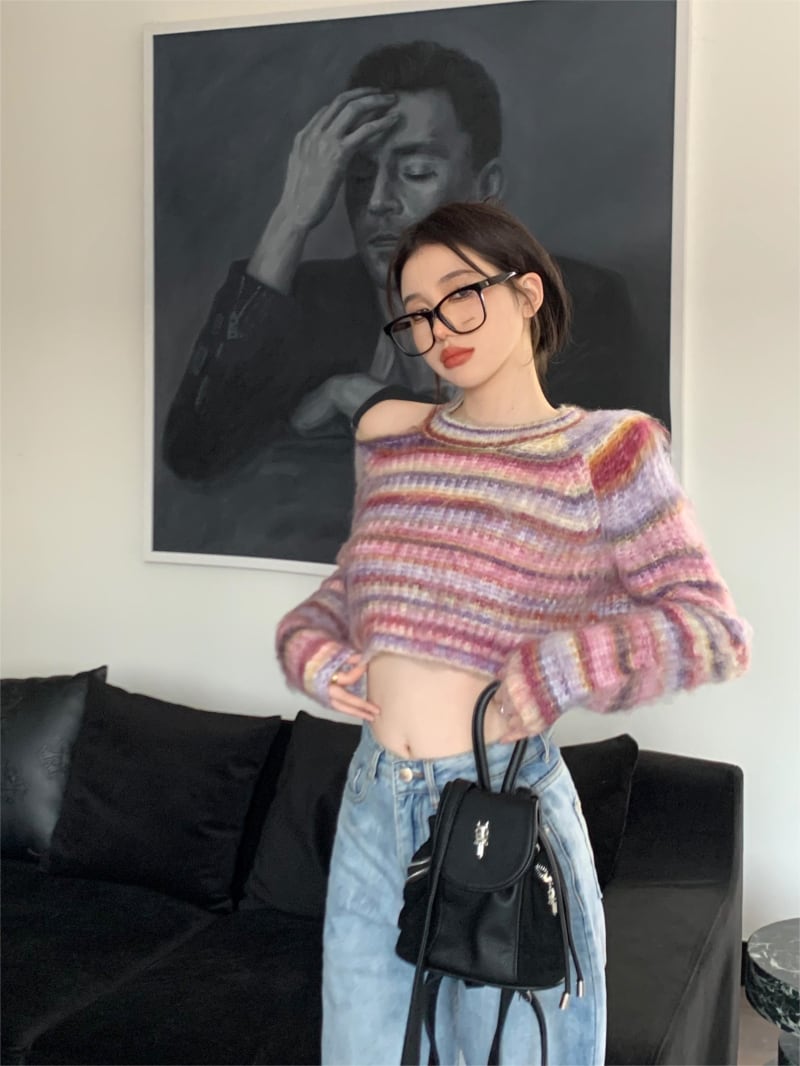 スイート スパイス ガールズ スキーミング中空プルオーバー セーター レディース 春と秋 2023 グラデーション パープル ルーズ ショート クロップド トップ 大人ガーリー スウィート キュート カジュアル スプリング 春物 オータム 秋物 0921960630261974