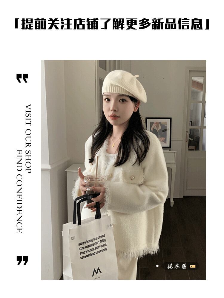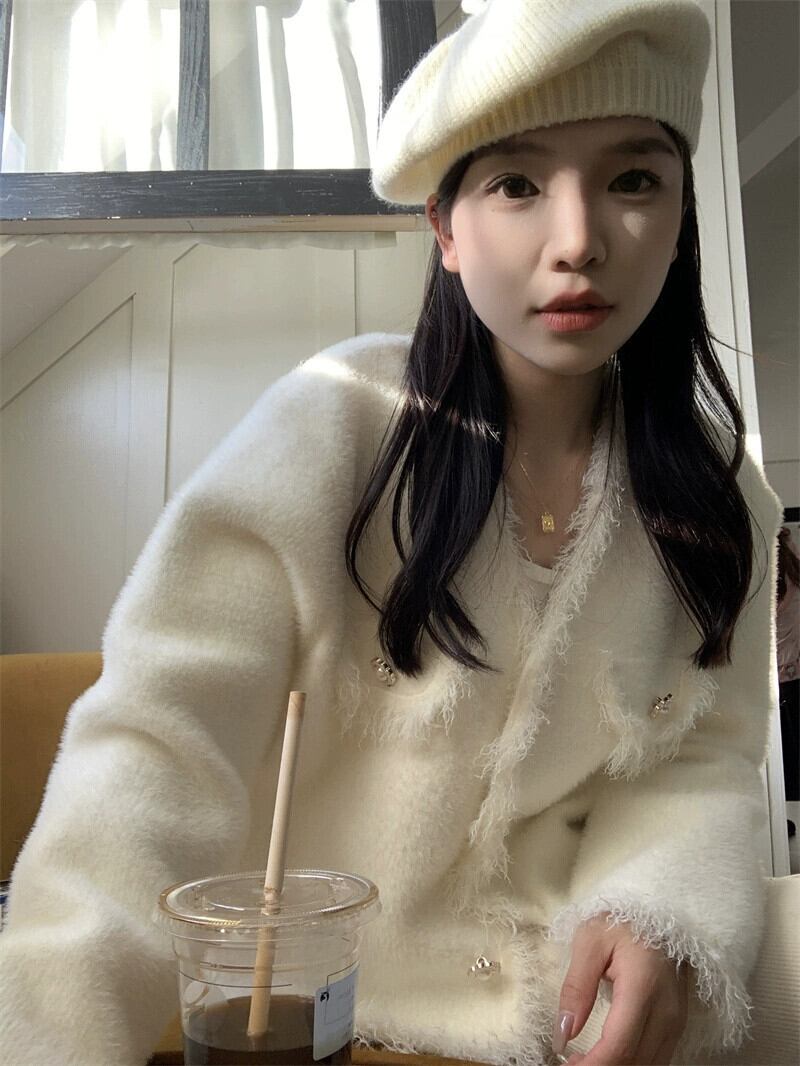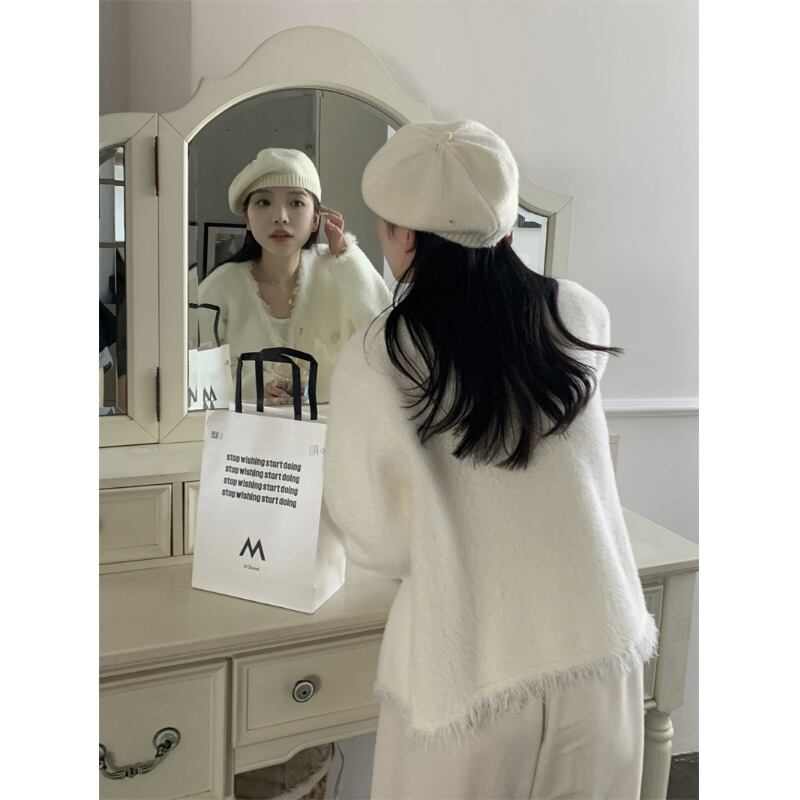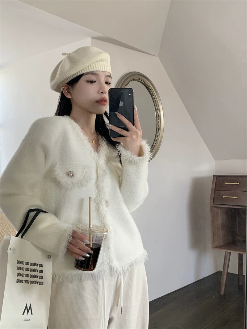 Xiaoxiangfengのバージョンの白いVネックセーターコートの女性の春と秋の厚みのあるハイエンドの感覚のテルエッジショートカーディガントップ ホワイト スプリング 春物 オータム 秋物 0921967852298403