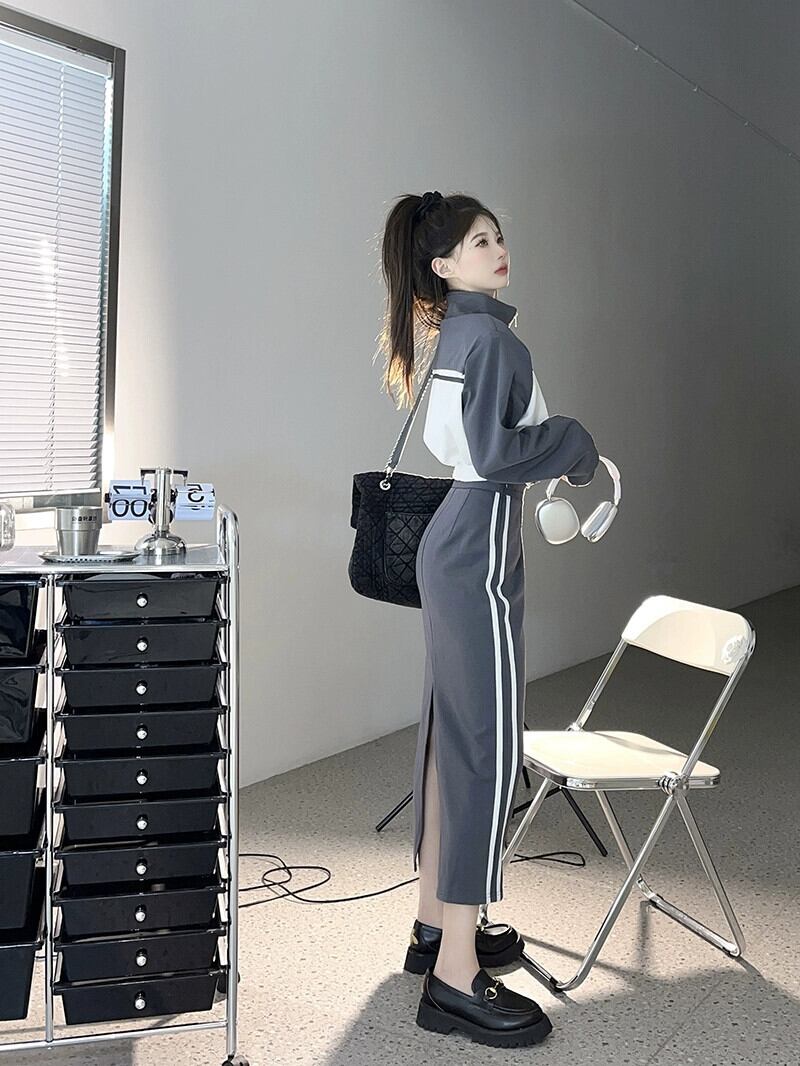 バージョンのフライドストリートファッションスーツスカート女性2023春新配色ジャケットスリットスカート2点セット スプリング 春物 0921972041287541