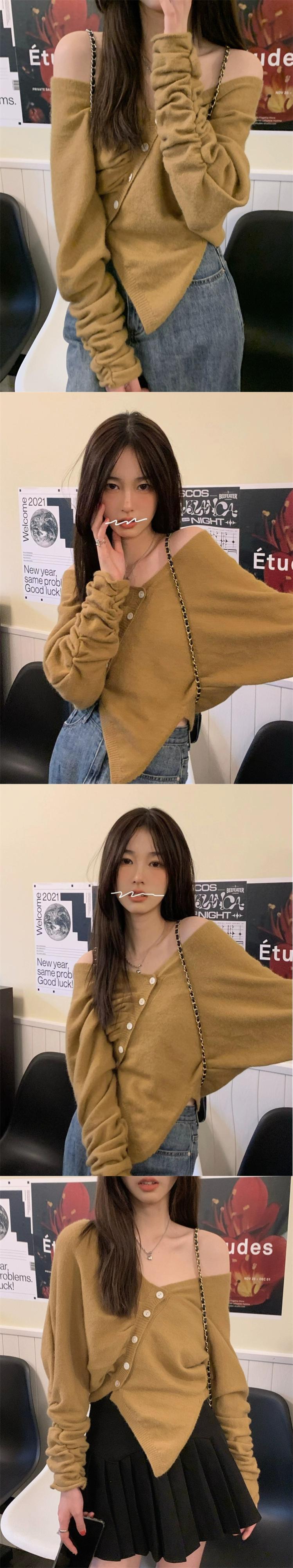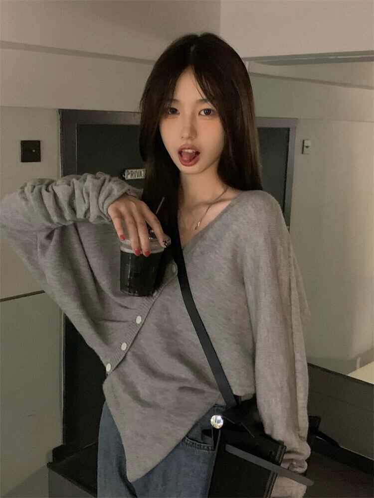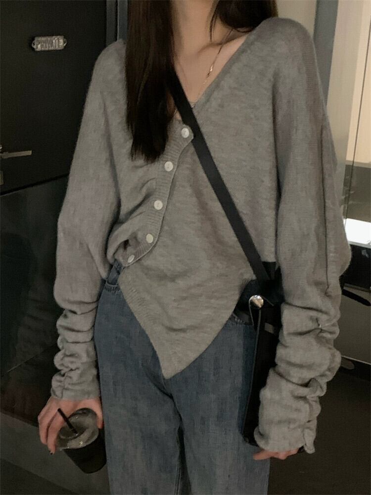 気質デザインセンスニッチ長袖ニットセーター婦人服2023春の新しいシックなプリーツショートVネックトップ ロング スプリング 春物 0921951863801031