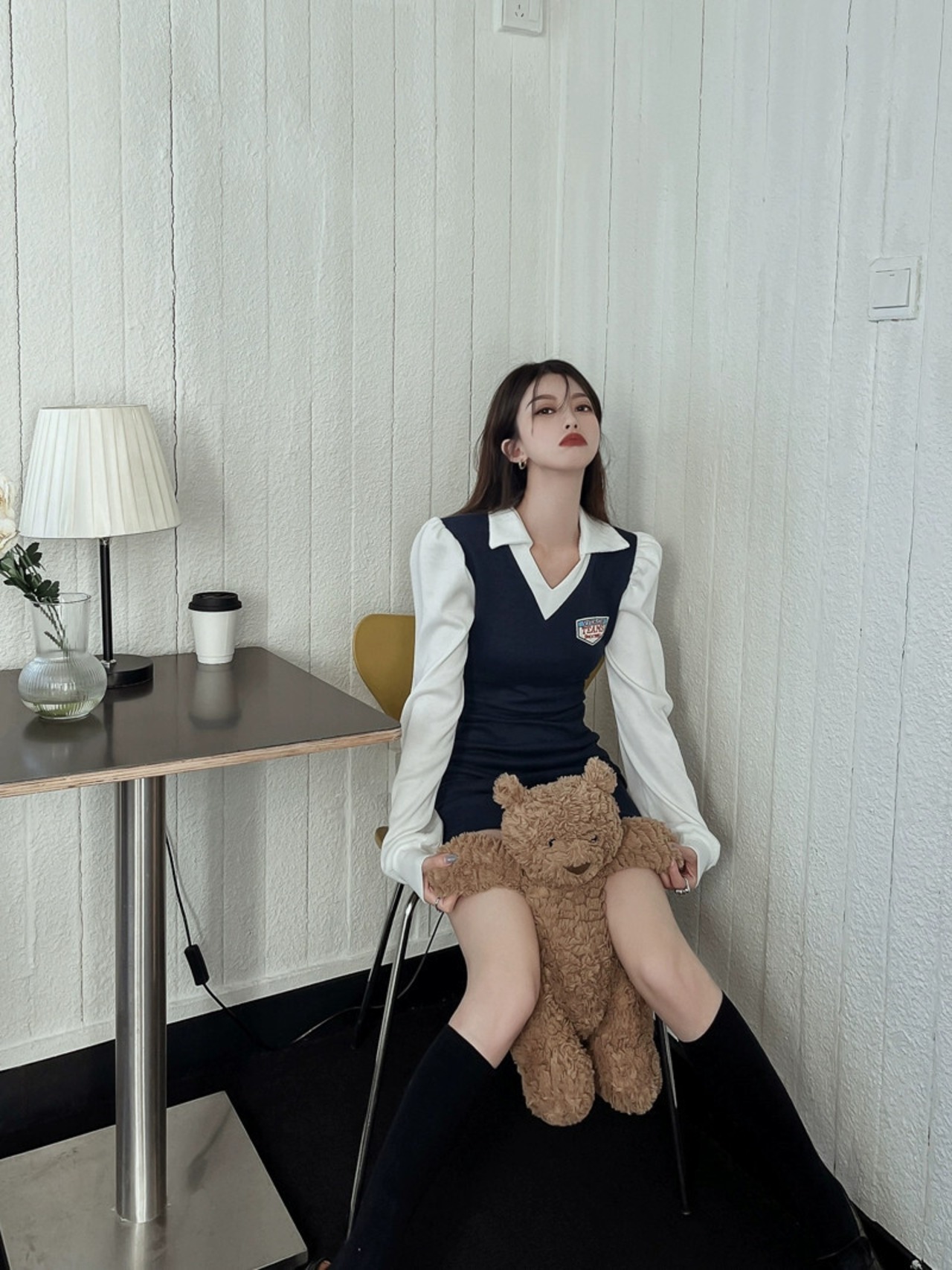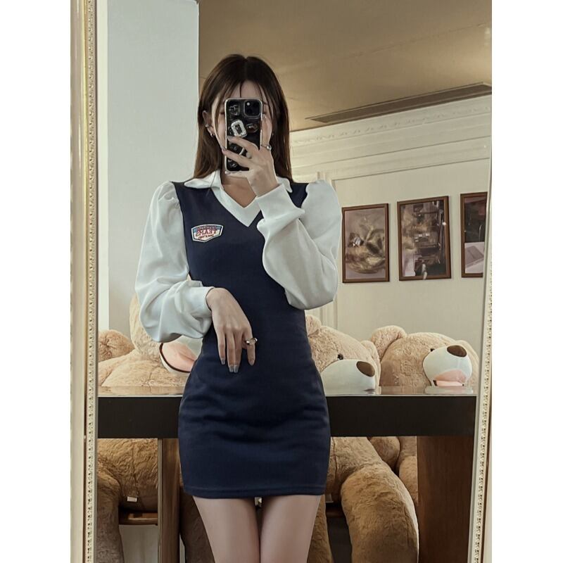アメリカンプレッピースタイルのポロカラードレス女性の2023春の新しいウエストウエストコントラストカラー表示薄いパッケージヒップスカート スプリング 春物 0921932556939345