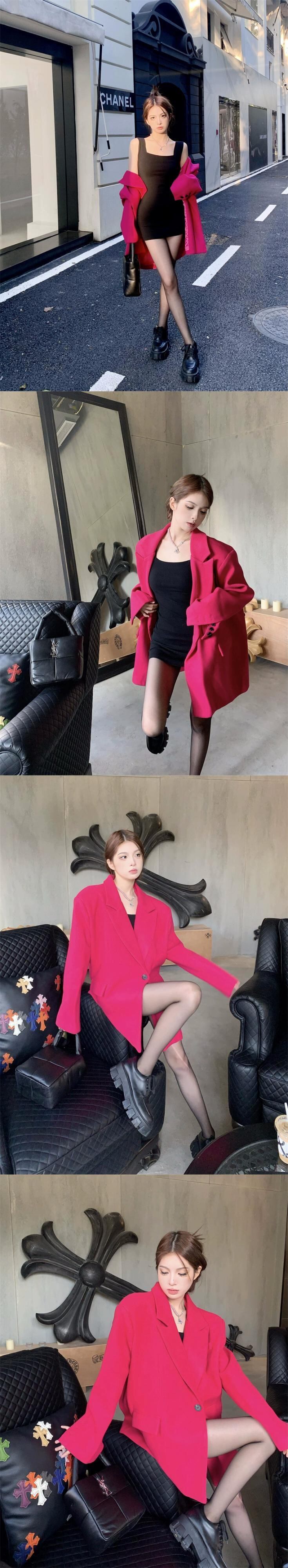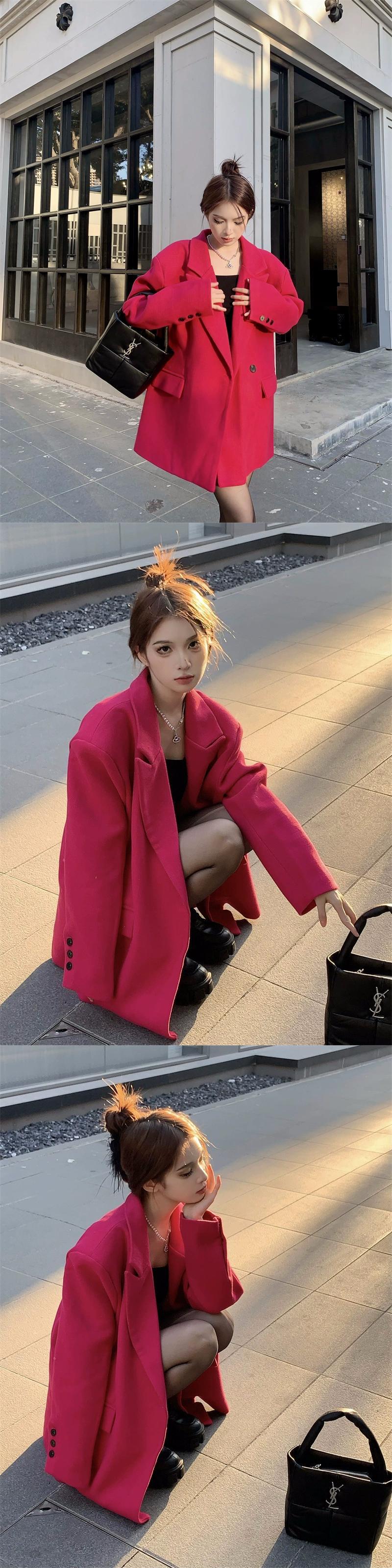 ドラゴンフルーツカラーのウールのスーツジャケットの女性の春と秋の2023新しいオールマッチルーズスリムミッドレングスのスーツジャケット スプリング 春物 オータム 秋物 0921965195676180