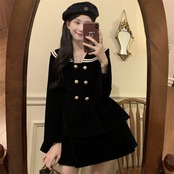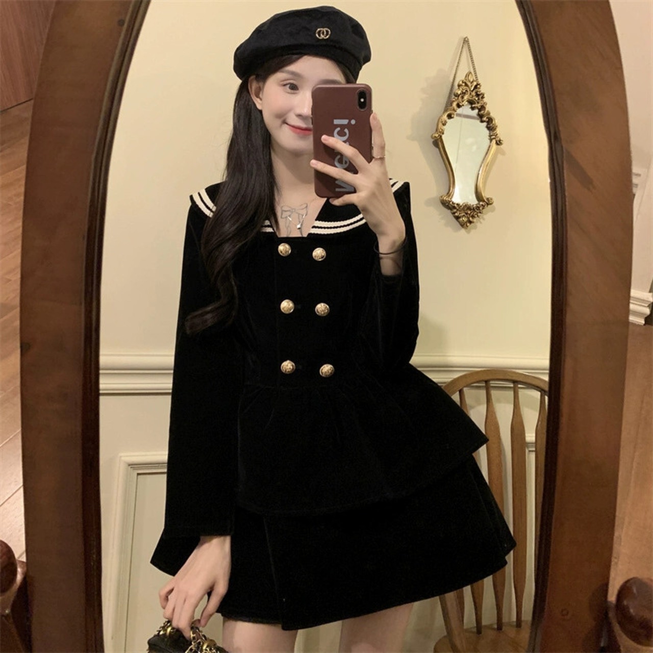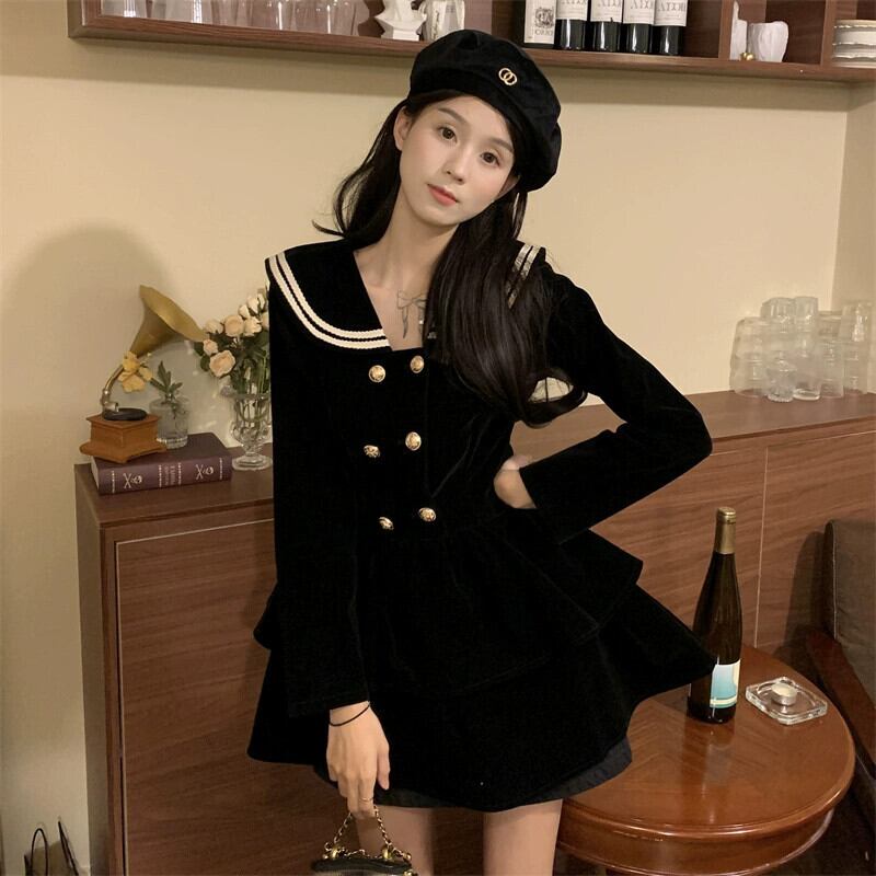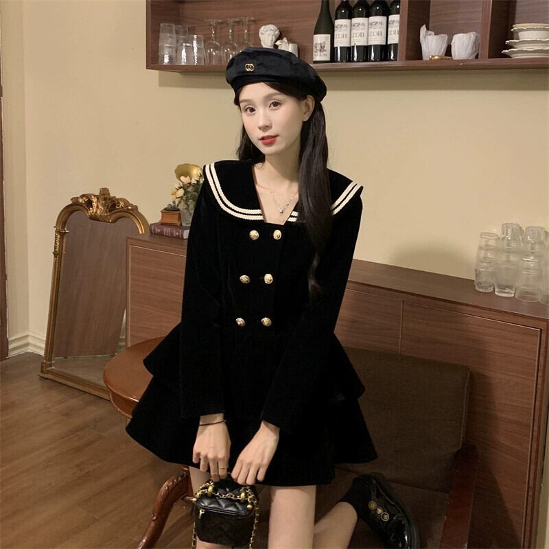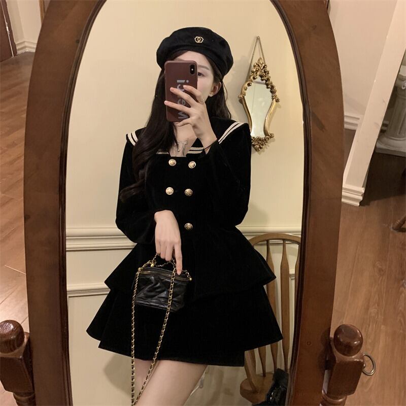 スタイルネイビーカラーボタンドレス女性 2023 春の新しいスタイルオールマッチ黒ふわふわスカート年齢削減 ブラック スプリング 春物 0921985007275486