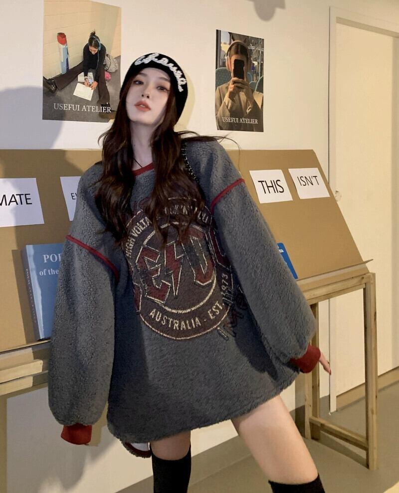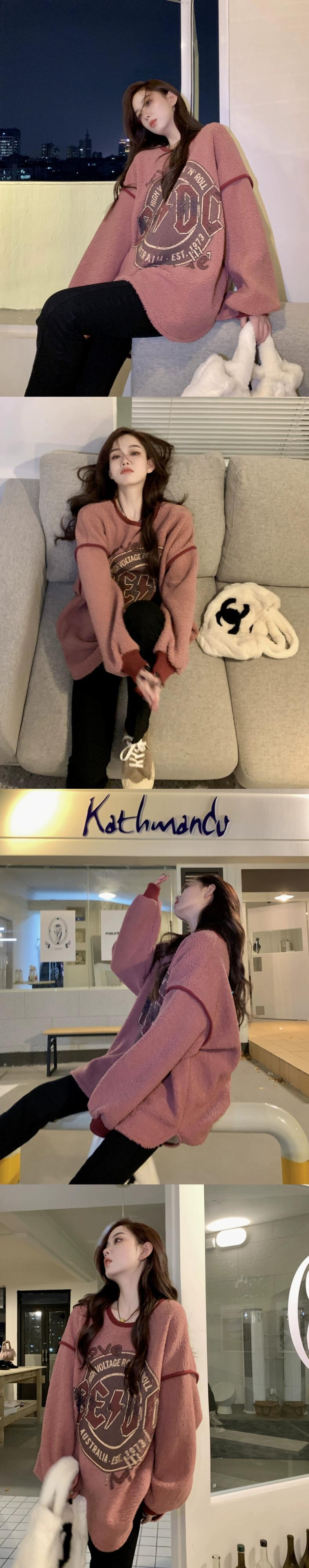 レトロニッチデザインプリントプルオーバーセーター女性の春と秋 2023 新しいルーズカジュアル模造ラムウールトップ スプリング 春物 オータム 秋物 0921986884592825