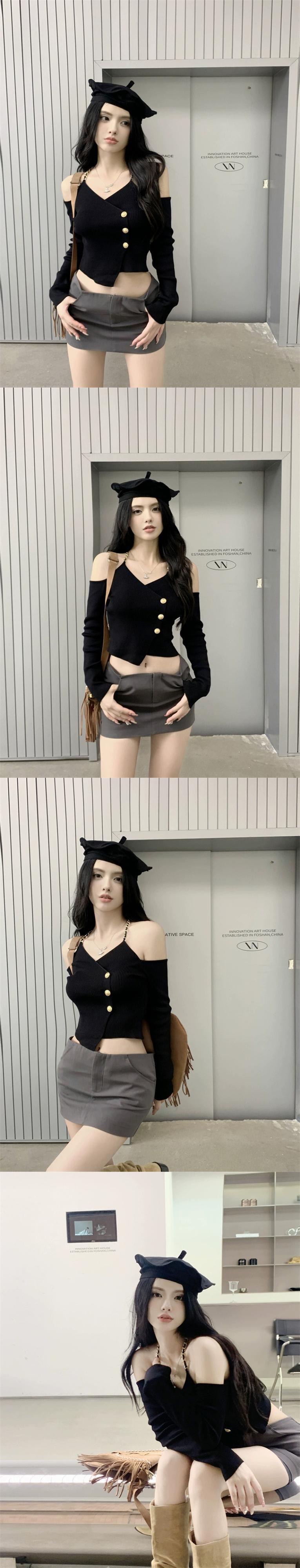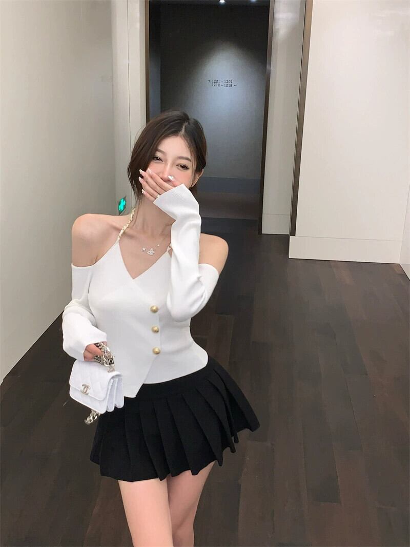 セクシーな気質ストラップレス吊りネック長袖ニットセーター女性の 2023 年春の新しいシックなスリムショートトップ ロング スプリング 春物 0921918358050778