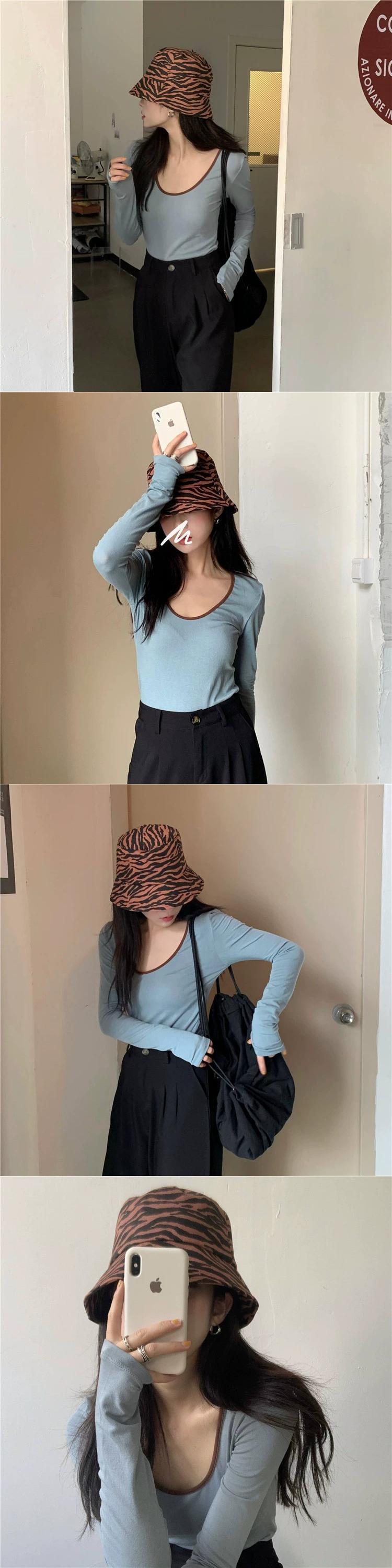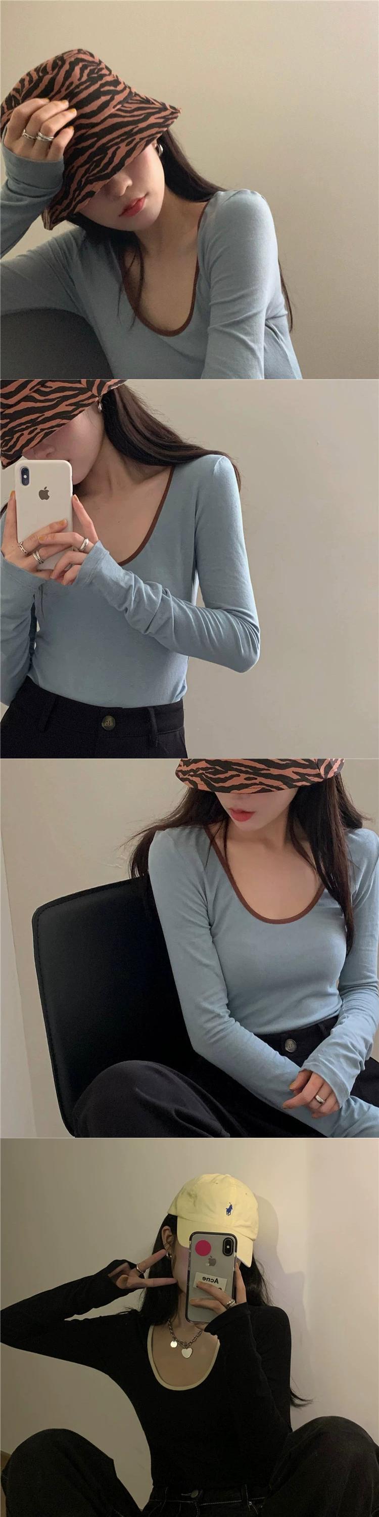 スタイルシンプルなコントラストカラー U ネック長袖 T シャツレディース 2023 春の新作オールマッチ気質スリムスリムトップイン ロング スプリング 春物 Tシャツ 092194647919357