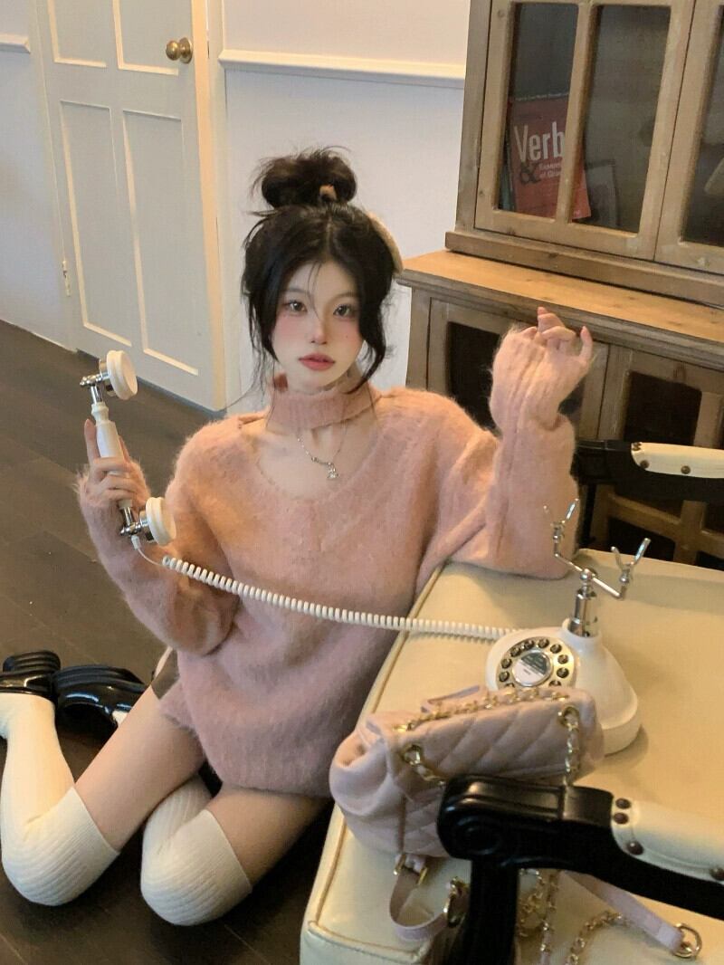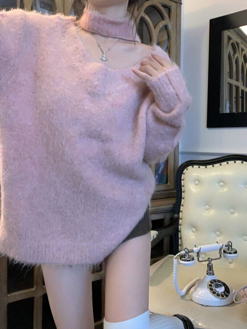 怠惰なスタイルピンクルーズハンギングネックプルオーバーセーター女性の春と秋 2023 新しいソフトワックスイミテーションミンクベルベット長袖ニットセーター ロング スプリング 春物 オータム 秋物 0921998030775662