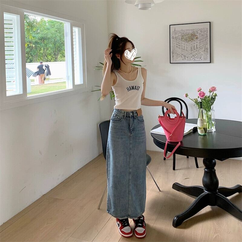 レトロハイウエストスリムデニムスカートレディース 2023 夏の新作ミドル丈ルーズシックなスリット A ラインスカート ハイウェスト サマー 夏物 Aライン 092199109546526