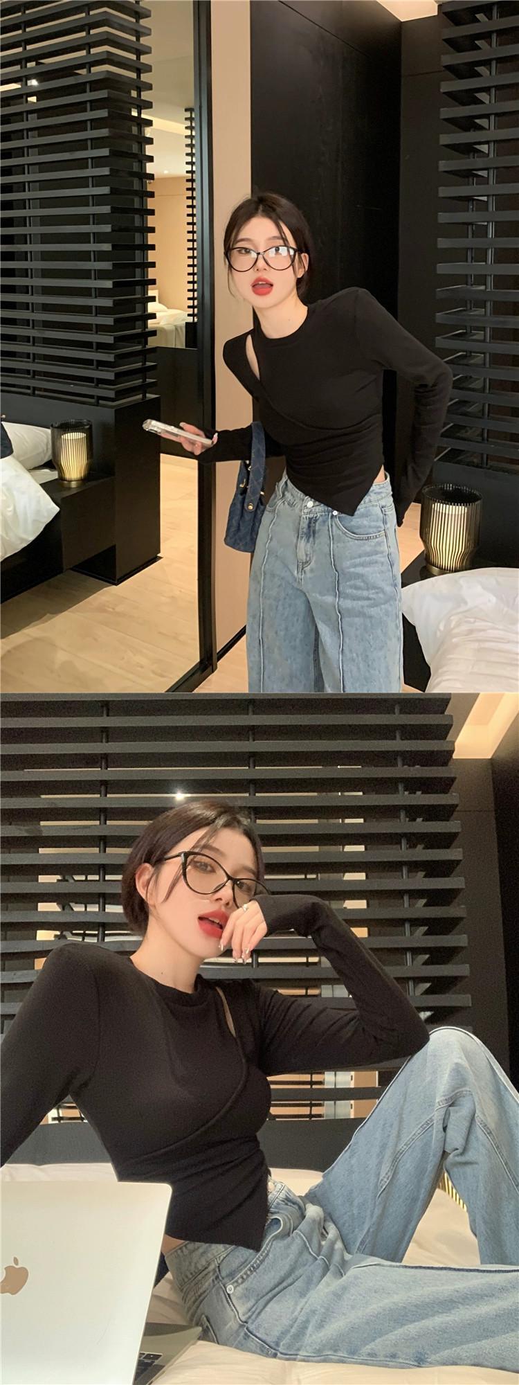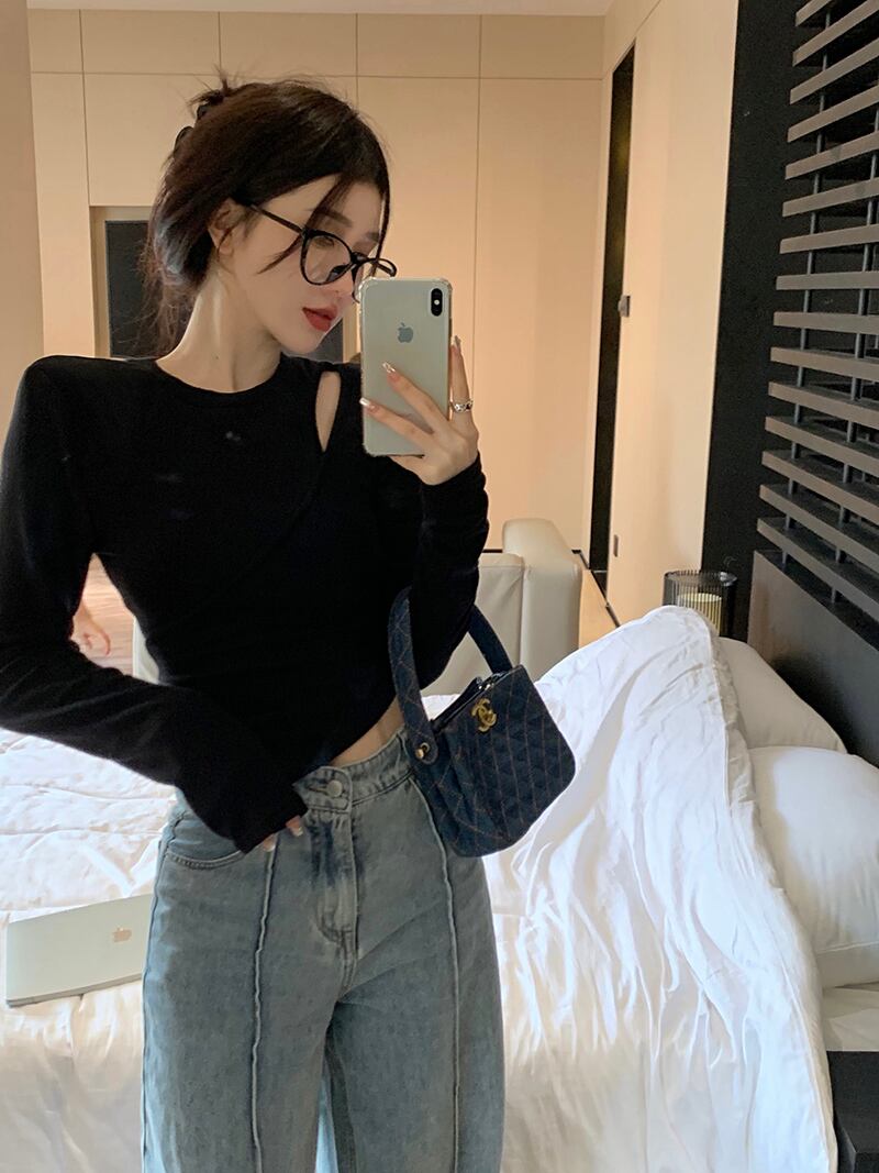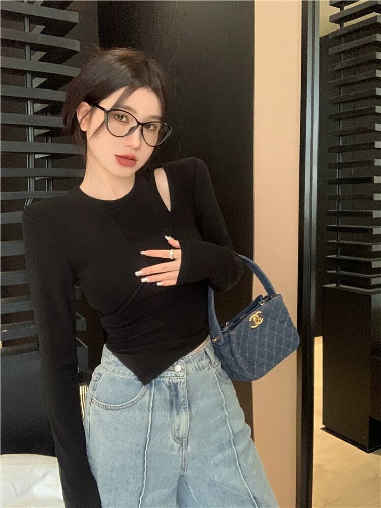 不規則なデザインセンス中空ショート長袖Tシャツレディース2023春の新作スリムフィットと薄底トップトレンド ロング スプリング 春物 0921984623486749