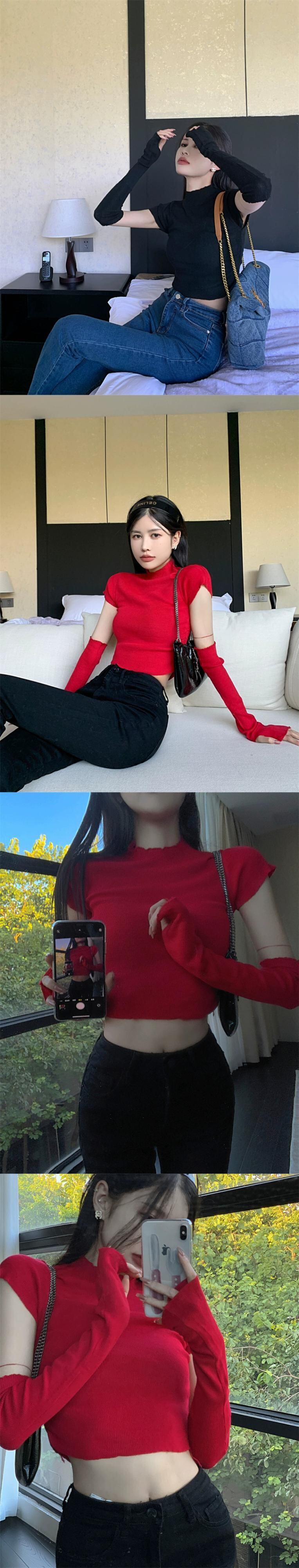 香港スタイルのセクシーなハーフハイカラーショートニットセーター女性の 2023 春の新作スリムスリム袖付きアウタートップ スプリング 春物 0921980032402281