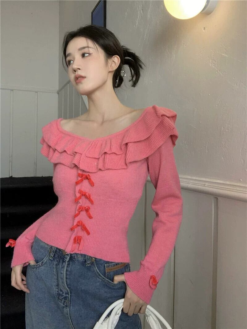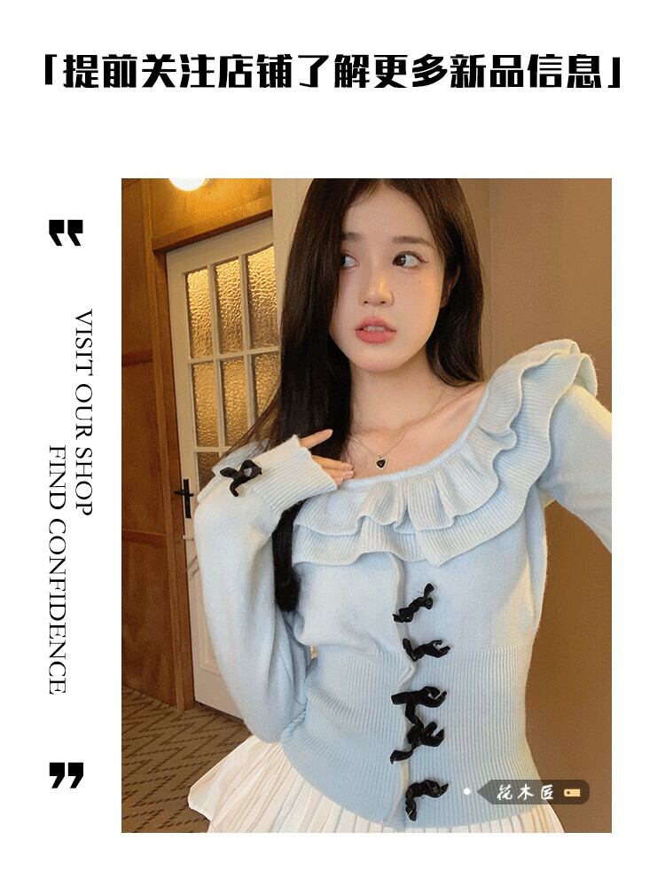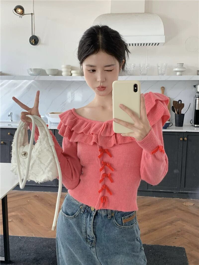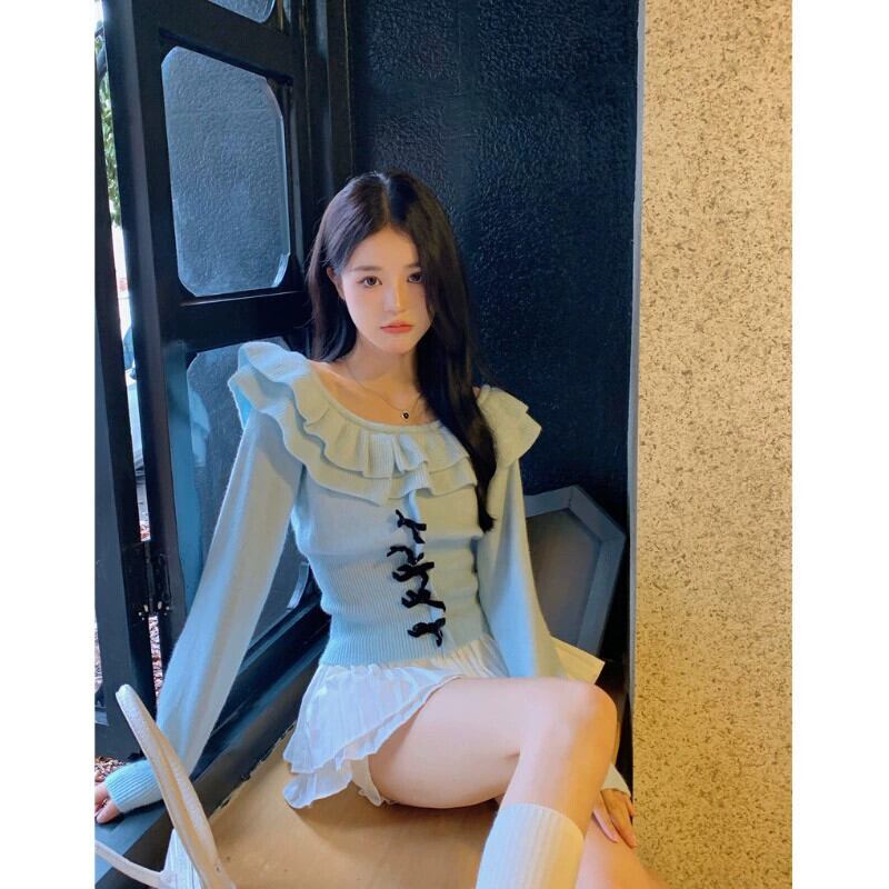 バージョンの年齢を減らすフリル長袖ニットセーター女性の 2023 年春の新しいウエスト痩身スイートボウセーター ロング リボン ラッフル 大人ガーリー スウィート キュート カジュアル スプリング 春物 0921949451242782