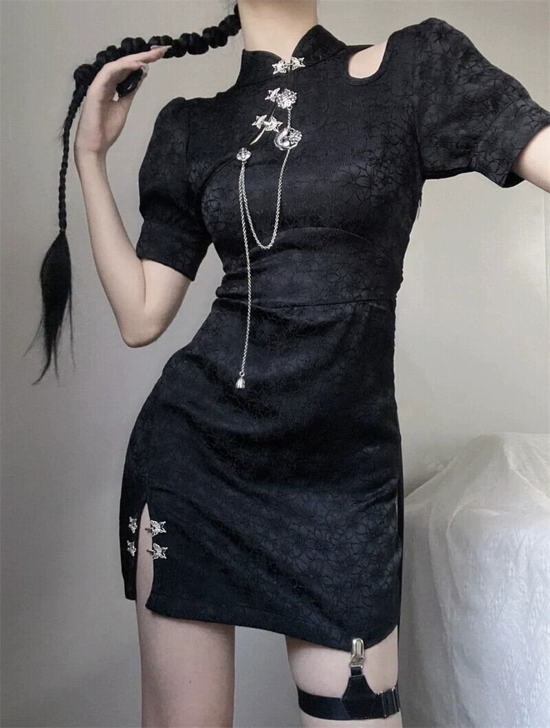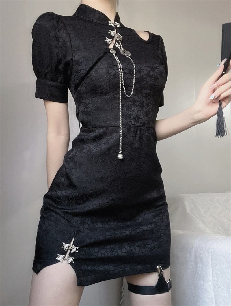 レトロ中国風改良チャイナドレス夏2023セクシーな中空スリムスリット小さな黒スカート ブラック サマー 夏物 0921948176021072