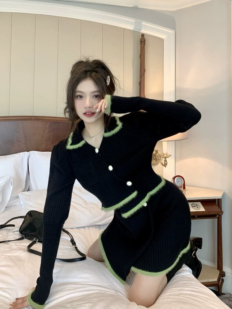 小さな香りのスーツの女性の 2023 年冬新色コントラストニットジャケットハイウエストスカート 2 点セット ハイウェスト ウィンター 冬物 0921943762952271