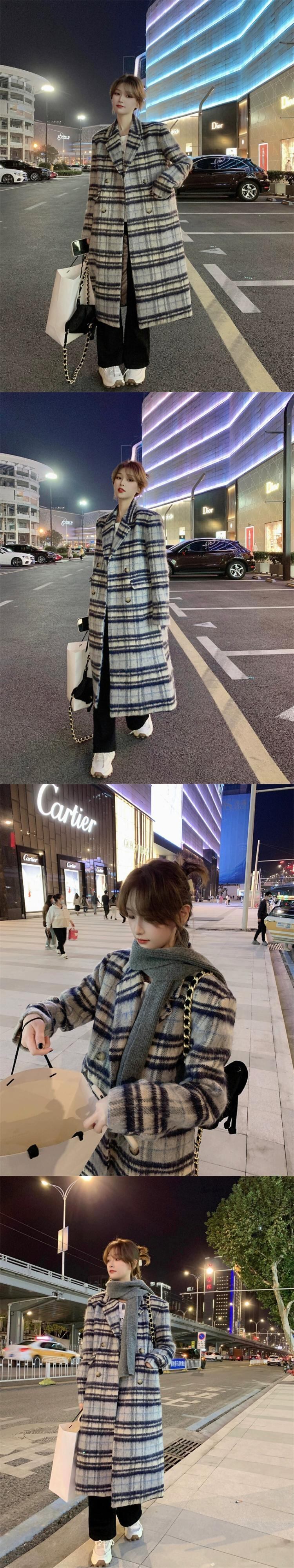 レトロチェック柄キルティングウールコートの女性の冬の 2023 新しいルーズミッドレングス膝上気質ウールコート ウィンター 冬物 0921943697715015