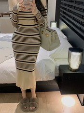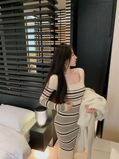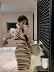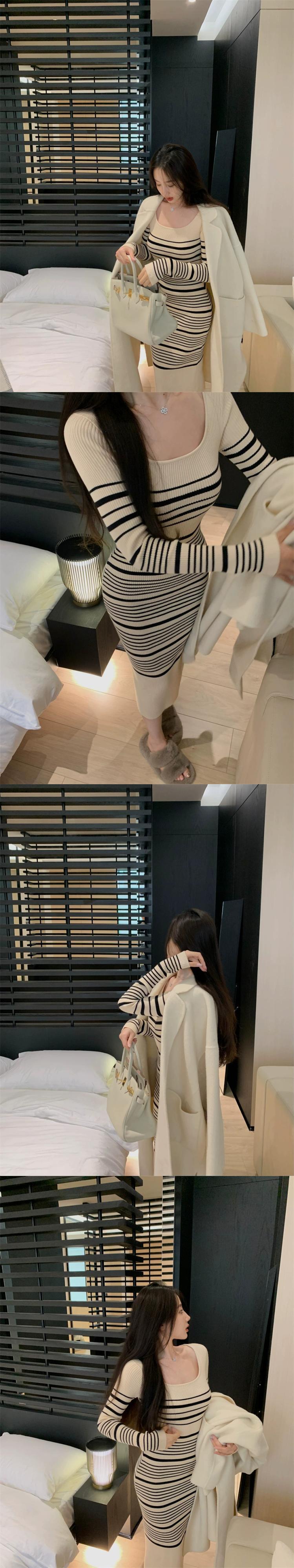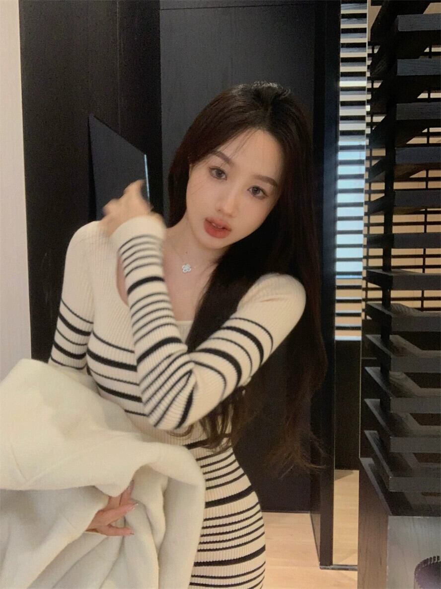 ヘップバーンスタイルスクエアカラーストライプ長袖ドレス女性の春と秋 2023 新しいオールマッチスリムスリムニットロングスカート潮 スプリング 春物 オータム 秋物 スクウェア 0921936289084413