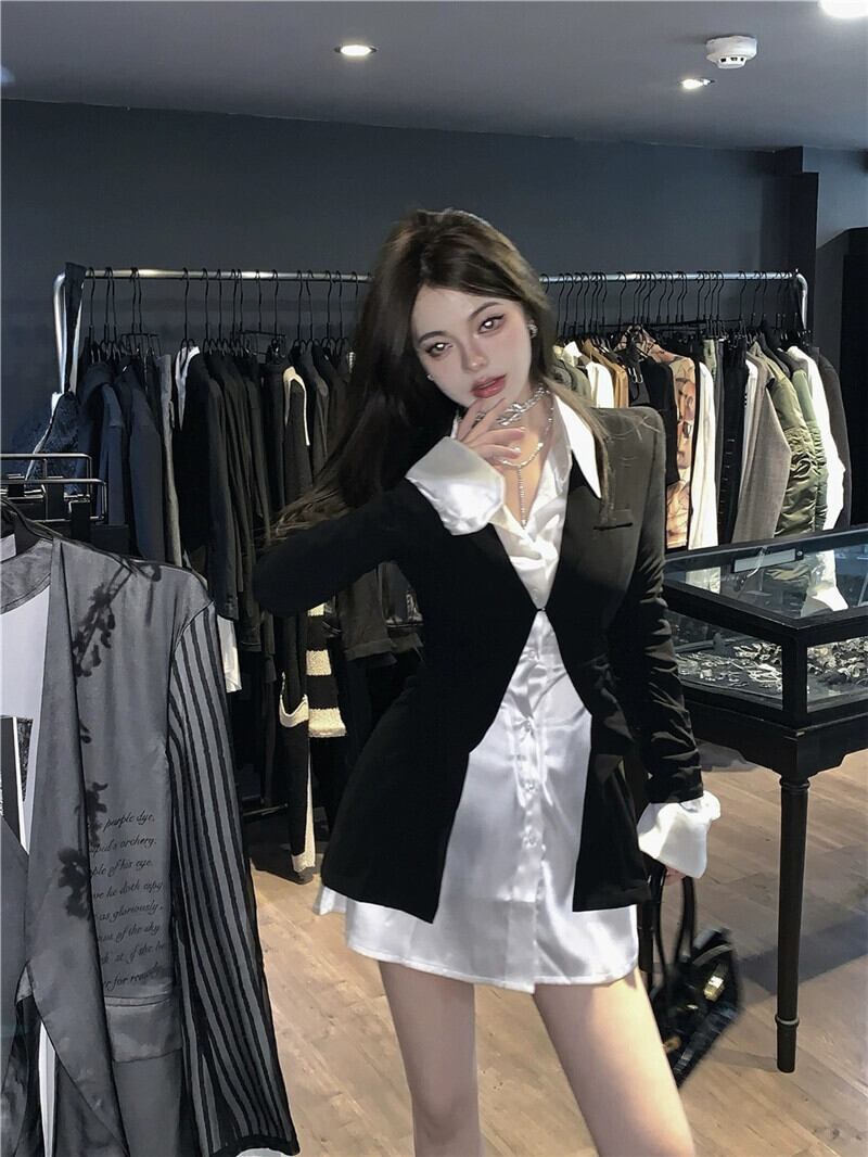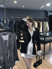 アメリカンスタイルのウエストシャーリングラペル長袖ドレスレディース2023春秋新作オールマッチ薄手スーツAラインスカート ロング スプリング 春物 オータム 秋物 0921968583550453