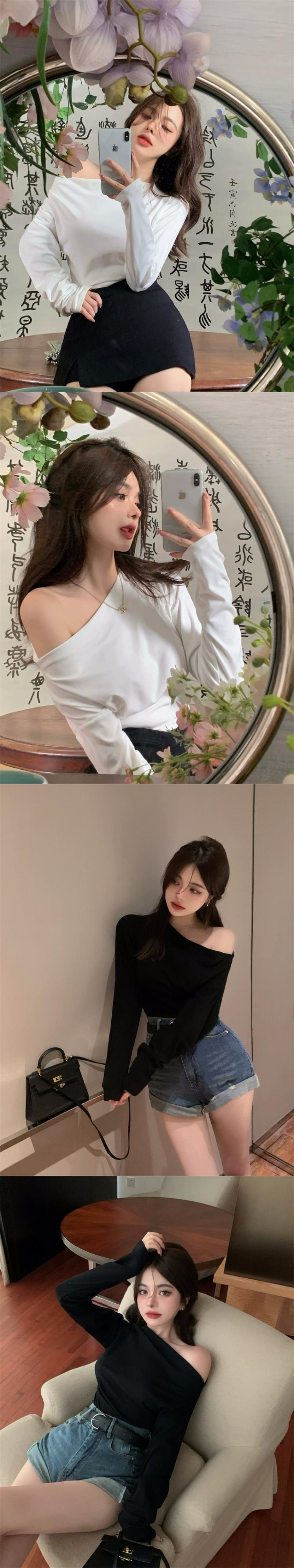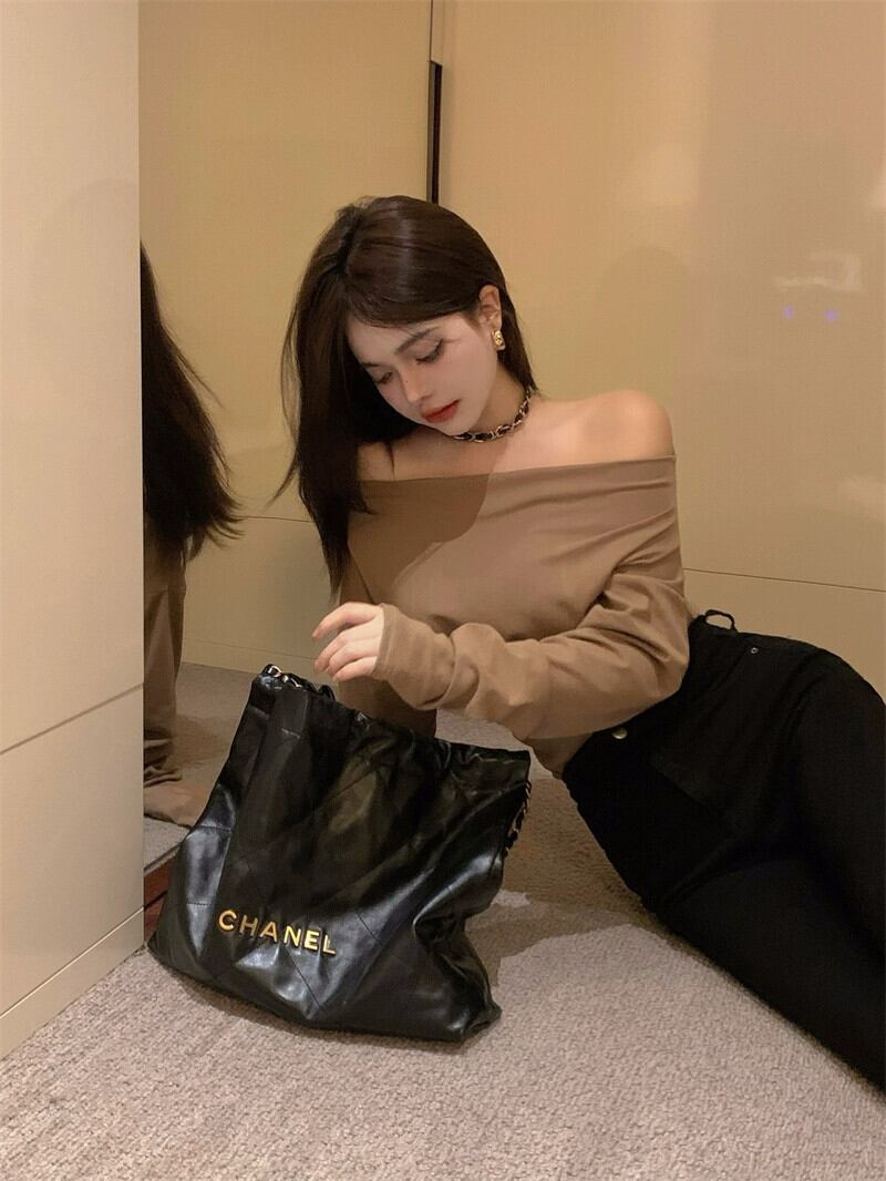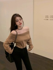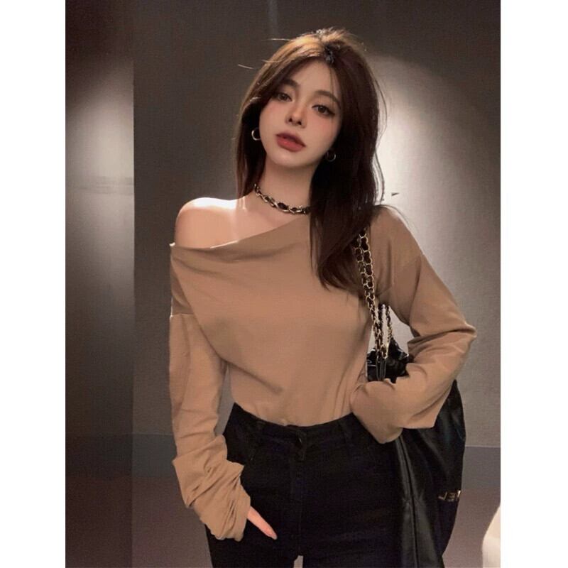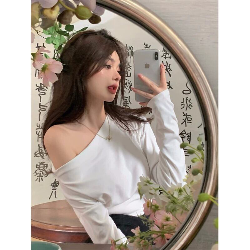 センスオールマッチ一言襟オフショルダー長袖 Tシャツレディース 2023 春秋新作痩身薄底シャツトップ ロング スプリング 春物 オータム 秋物 092199704752232