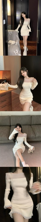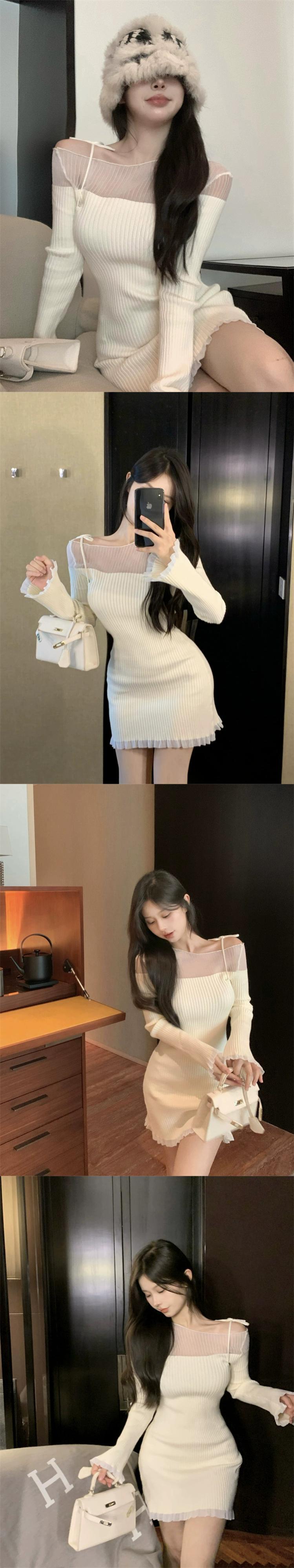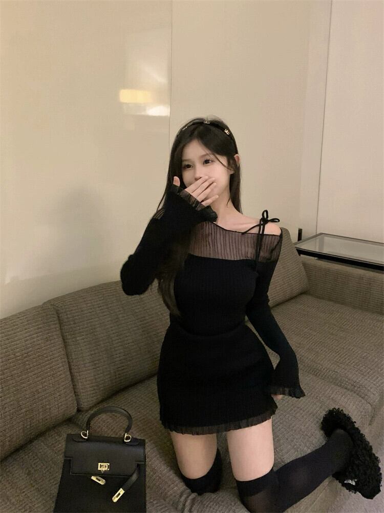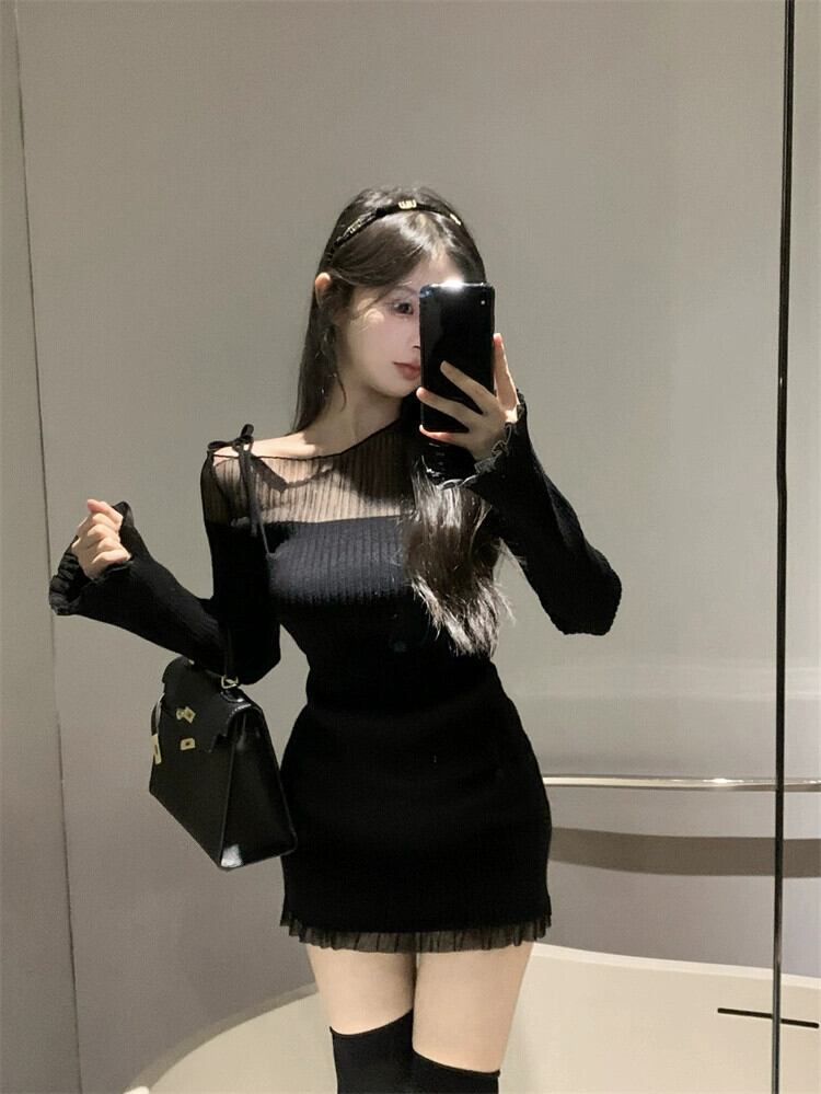 純粋な欲望のメッシュステッチニット長袖ドレスの女性の 2023 年春の新しい気質スリムで多用途な A ラインスカート ロング スプリング 春物 Aライン 0921997598263346