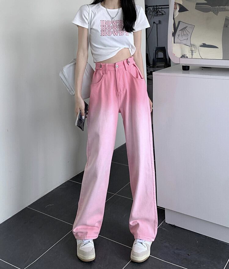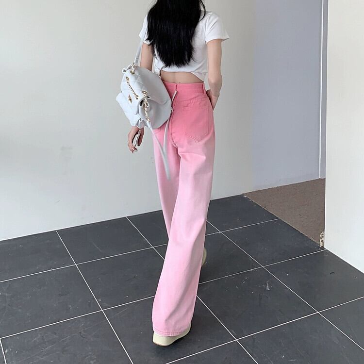 グラデーションピンクハイウエストドレープジーンズレディース2023年夏新作オールマッチルーズスリムワイドレッグモップパンツ ハイウェスト サマー 夏物 0921966353265896