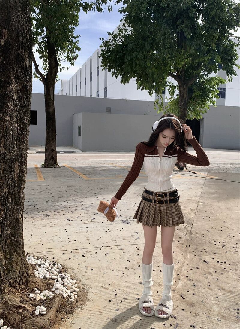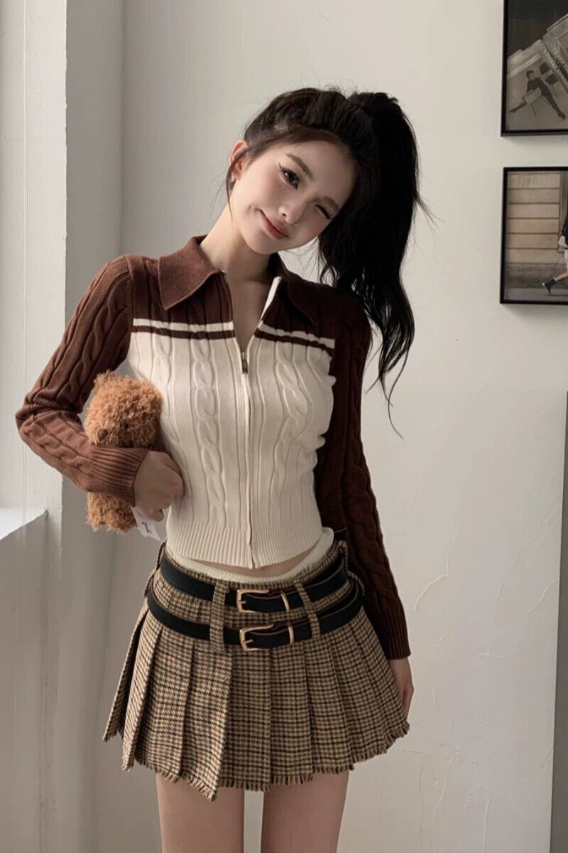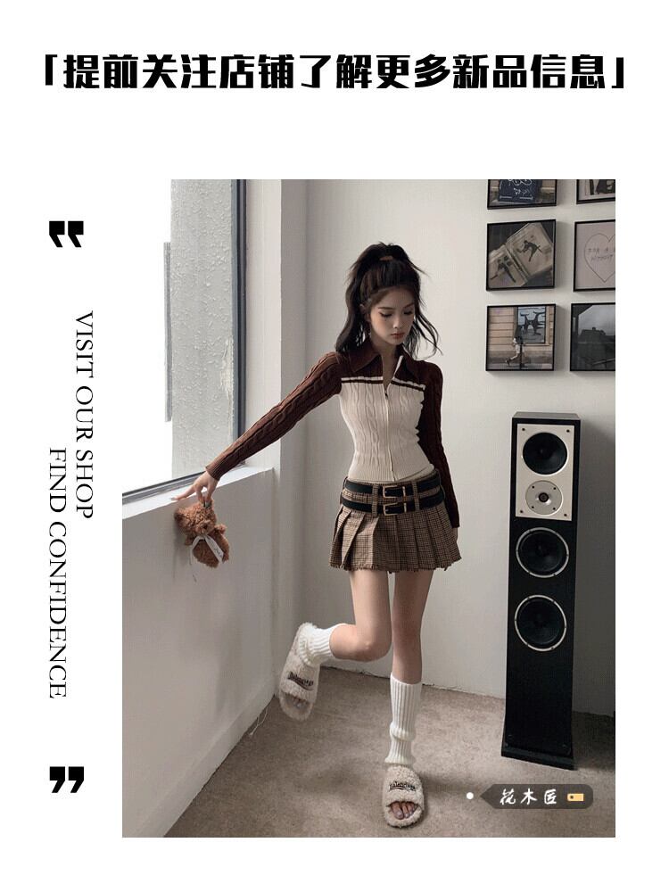 レトロコントラストカラーツイストニットカーディガンレディース2023春新作スリムフィットと薄いショートポロカラージッパーセーター スプリング 春物 0921978298501650