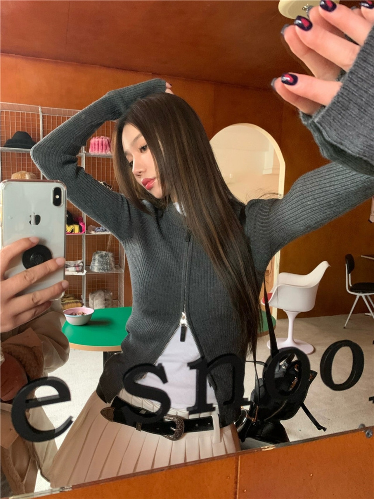 多彩なデザインのラウンドネックダブルヘッドジッパーニットカーディガンレディース2023春新作ショートスリムスリムトップ スプリング 春物 Oネック 0921920228928506