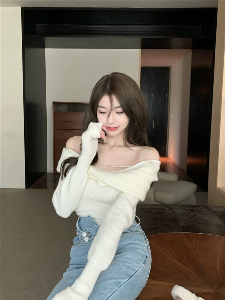 純粋な欲望セクシーな一言襟ニットセーター女性の春 2023 新しいニッチシックなデザイン長袖チェーンセーター ロング スプリング 春物 0921980306118483