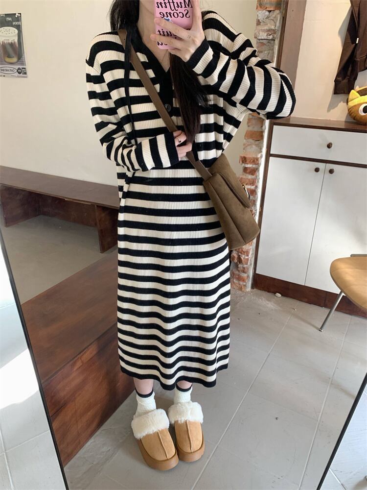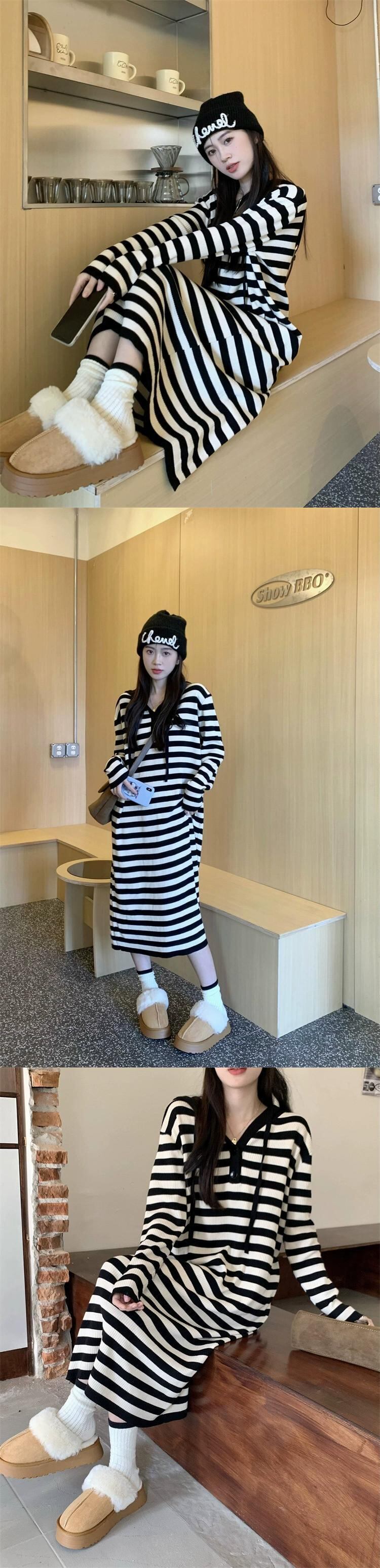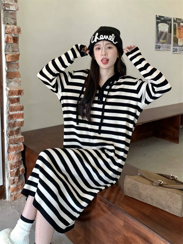 ニッチデザインセンスルーズストライプフード付き長袖ドレスレディース2023春新作オールマッチニットミドル丈スカート ロング スプリング 春物 0921919799253156