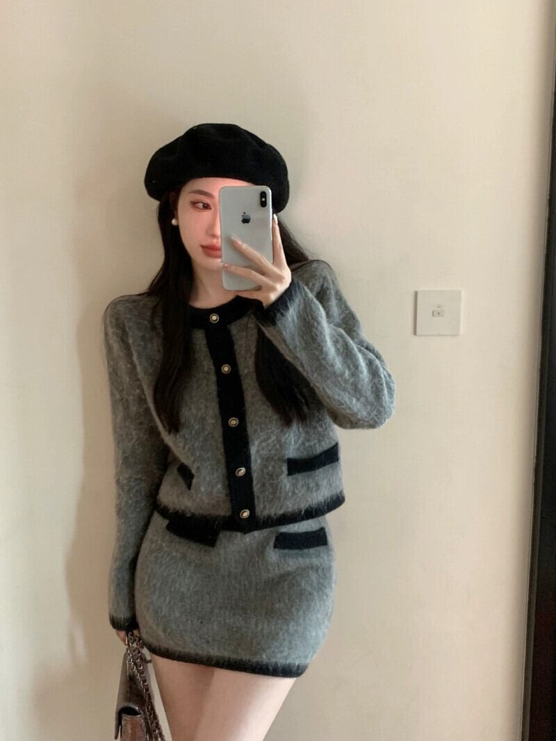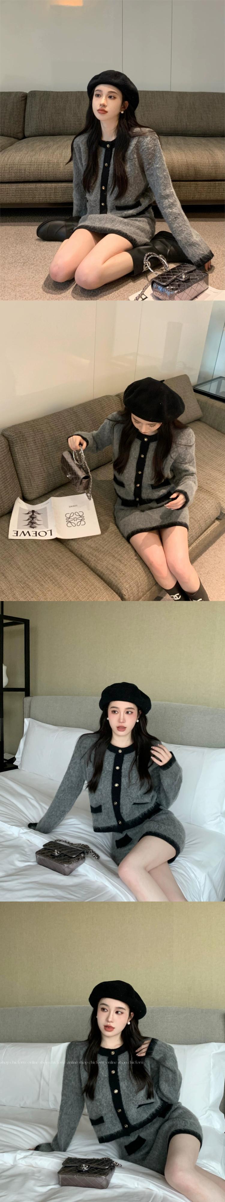 コントラストカラーの豪華な小さな香りのスーツの女性の 2023 春の新作ショートニットトップ痩身スカート 2 点セット スプリング 春物 0921984102970439