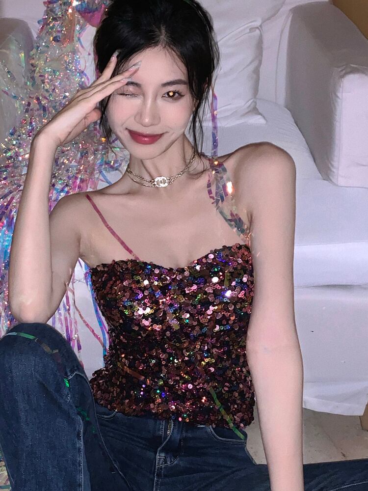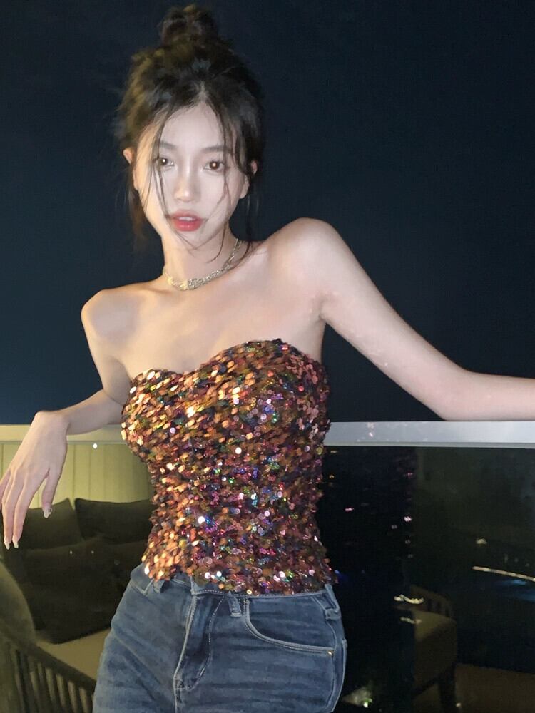 セクシーなカラーのスパンコールショートチューブトップ女性の夏の 2023 新しいオールマッチデザインセンススリムフィット薄型ベストトップ サマー 夏物 0921956604380458