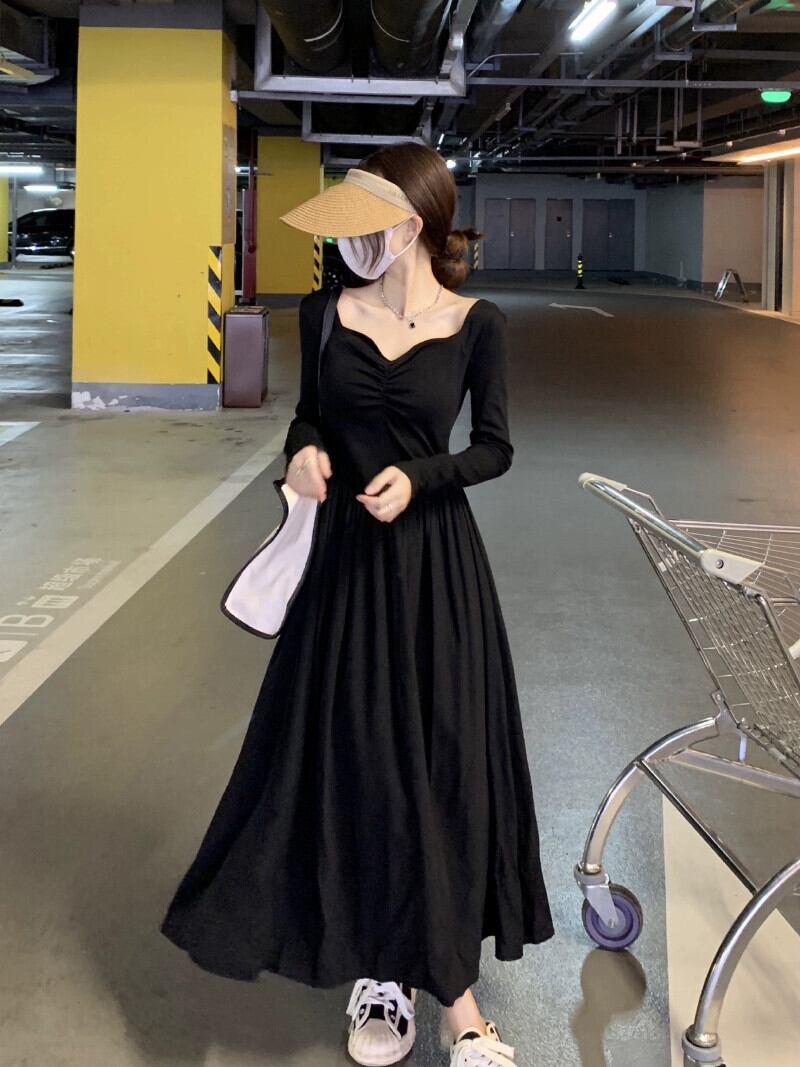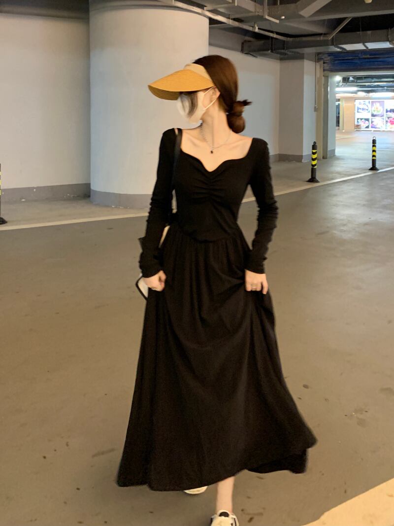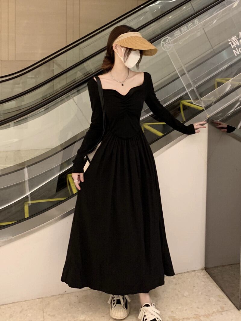 レトロなフランスの気質長袖ドレスの女性の 2023 春の新作ウエスト痩身ミッドレングスオールマッチリトルブラックドレス ロング スプリング 春物 0921944016459334
