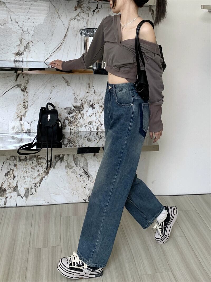 センスカラーコントラストストレートジーンズ女性の夏の 2023 新しいハイウエストスリムルーズワイドレッグモップパンツトレンディな ハイウェスト サマー 夏物 ワイドパンツ 0921966129668616