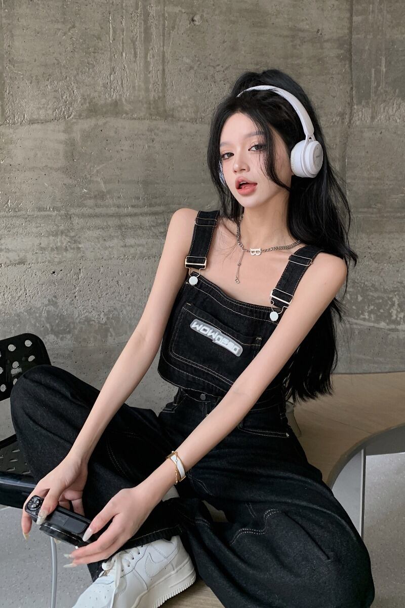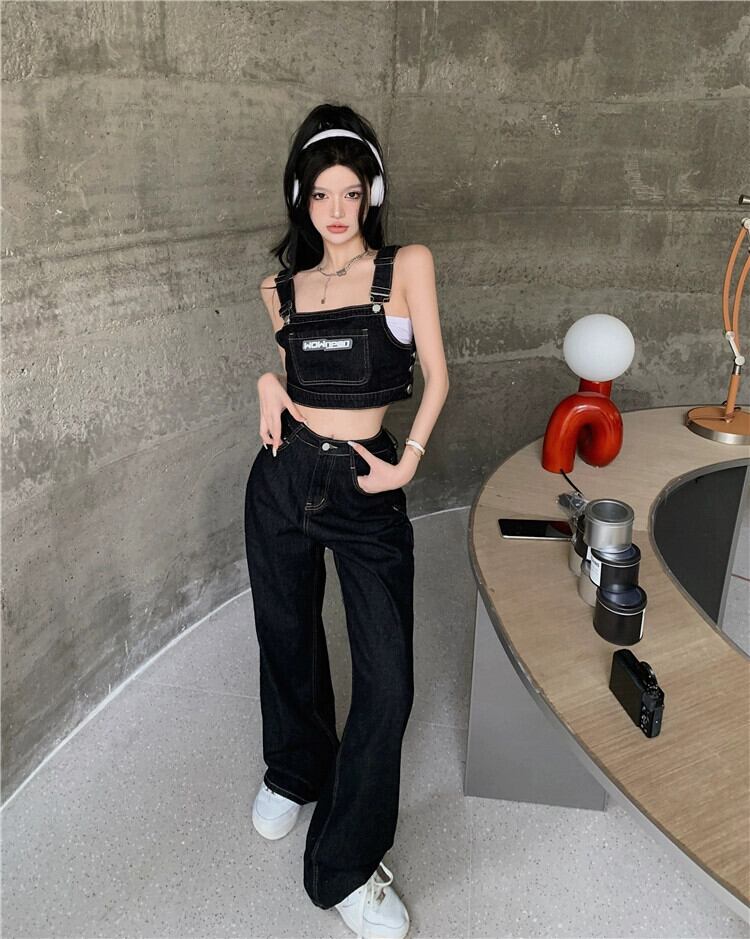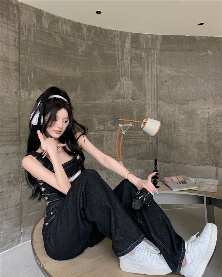 レトロファッションデニムスーツ女性 2023 春の新作サスペンダートップワイドレッグジーンズ 2 点セット スプリング 春物 0921959872360157