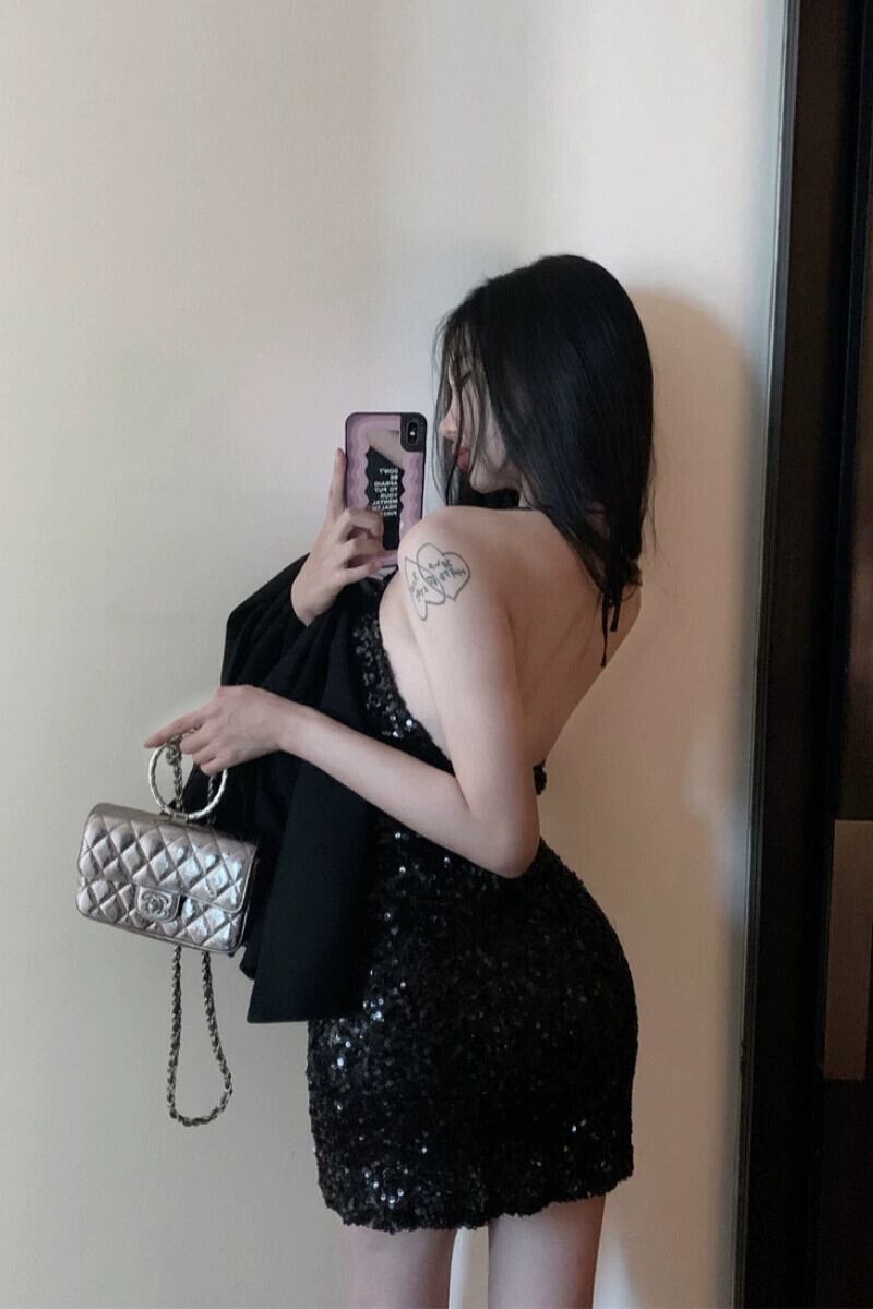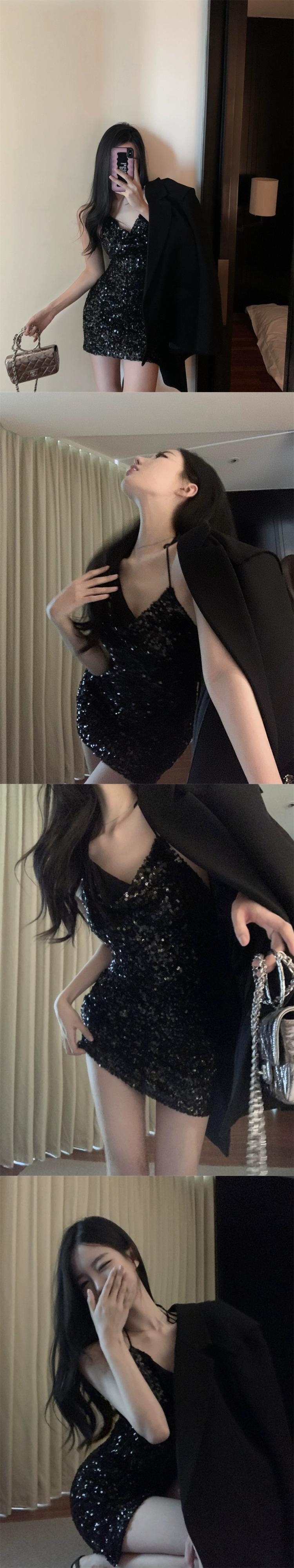 黒 V ネックスパンコールサスペンダードレス女性の夏の 2023 新しいスリムフィットスリムセクシーなバッグヒップショートスカートトレンディな ブラック サマー 夏物 Vネック 0921940947759765