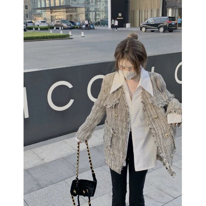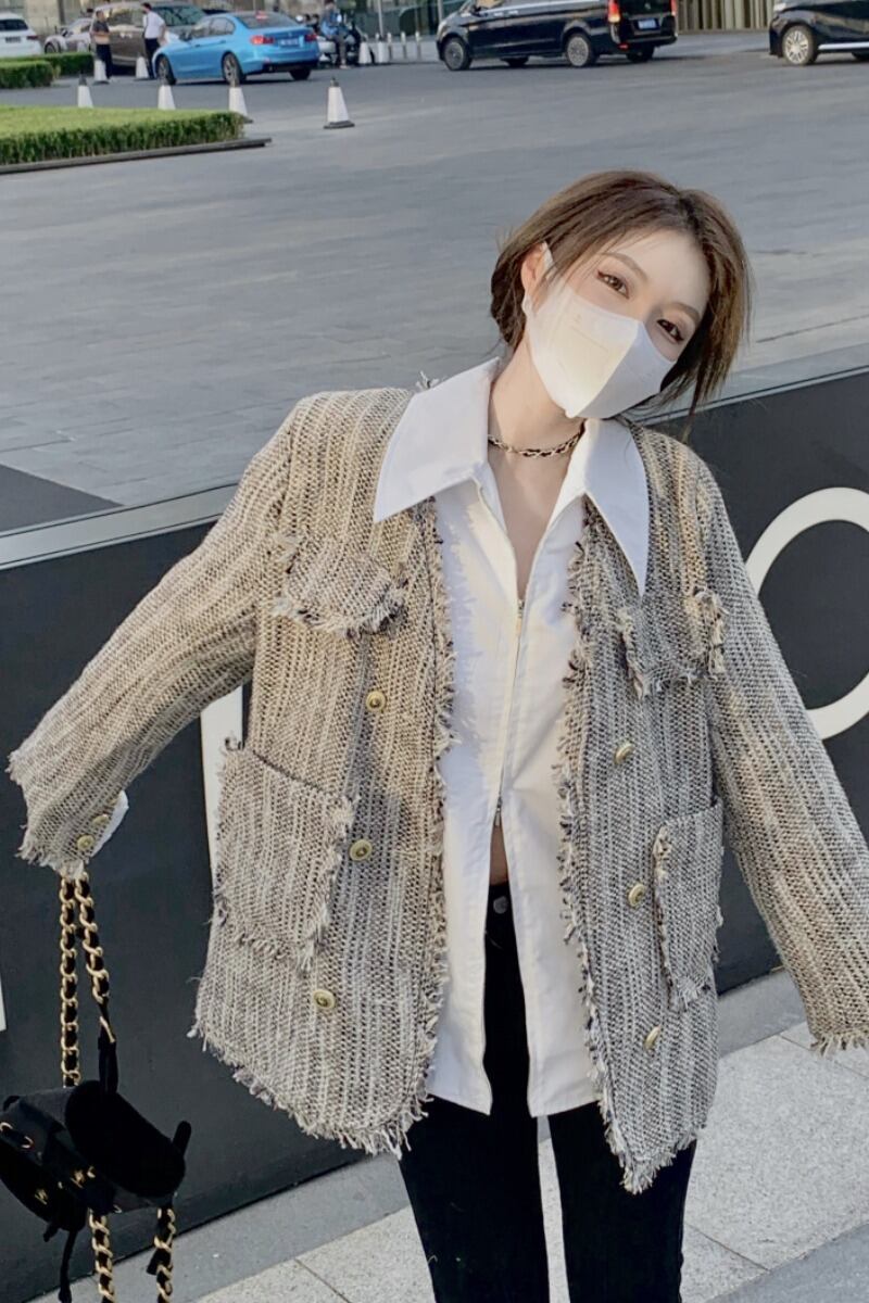 -エンド フリンジ ツイード スモール フレグランス ジャケット レディース 2023 春の新作ファッション ルーズ ミドル丈 トップ トレンド スプリング 春物 0921945303304443