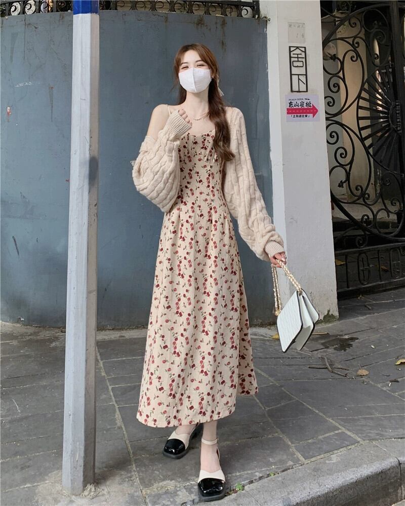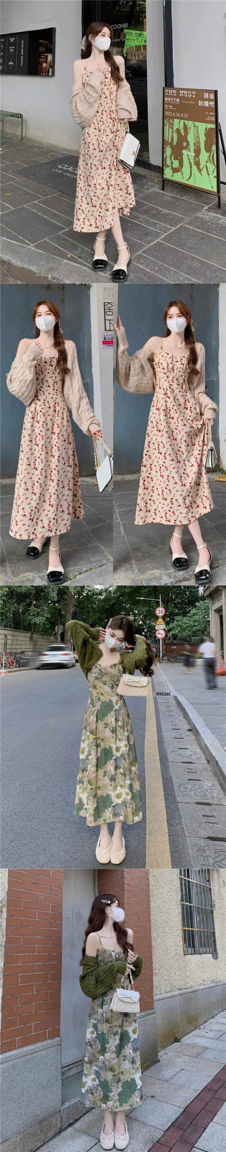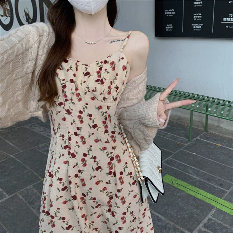 レトロフラワープリント気質サスペンダードレス女性 2023 春の新作フレンチスタイルの優しい風ミドル丈スカート スプリング 春物 フラワーデザイン 0921953770249998