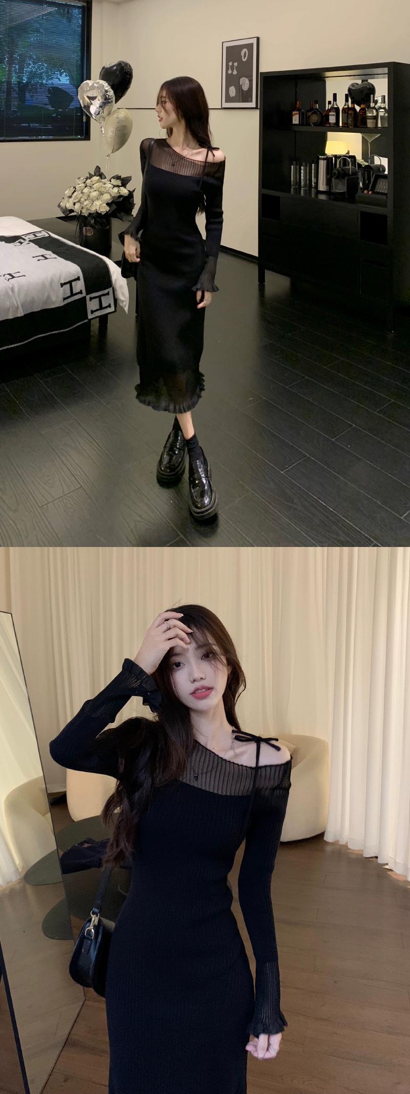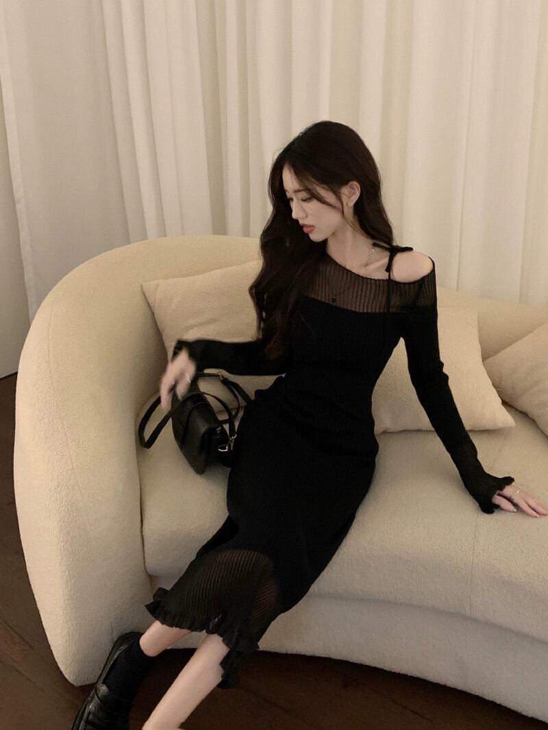 センスメッシュステッチニット長袖ドレス女性の 2023 春の新作スリムで薄いボトムのミドル丈スカート ロング スプリング 春物 0921996219931868