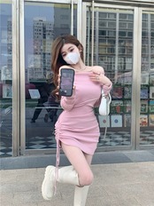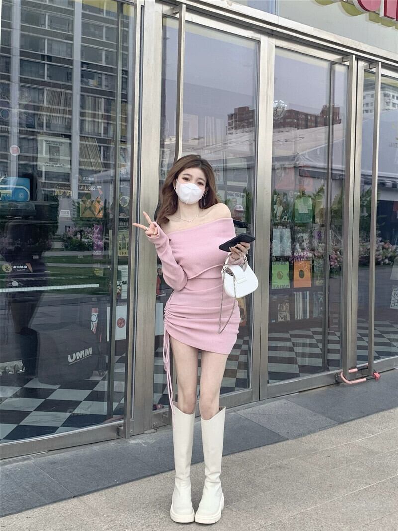 純粋な欲望一言襟プリーツネクタイ長袖ドレス女性の春 2023 新しいスリムとスリムニットスカート ロング スプリング 春物 0921958769277820