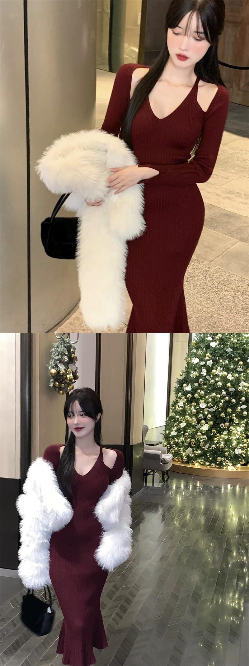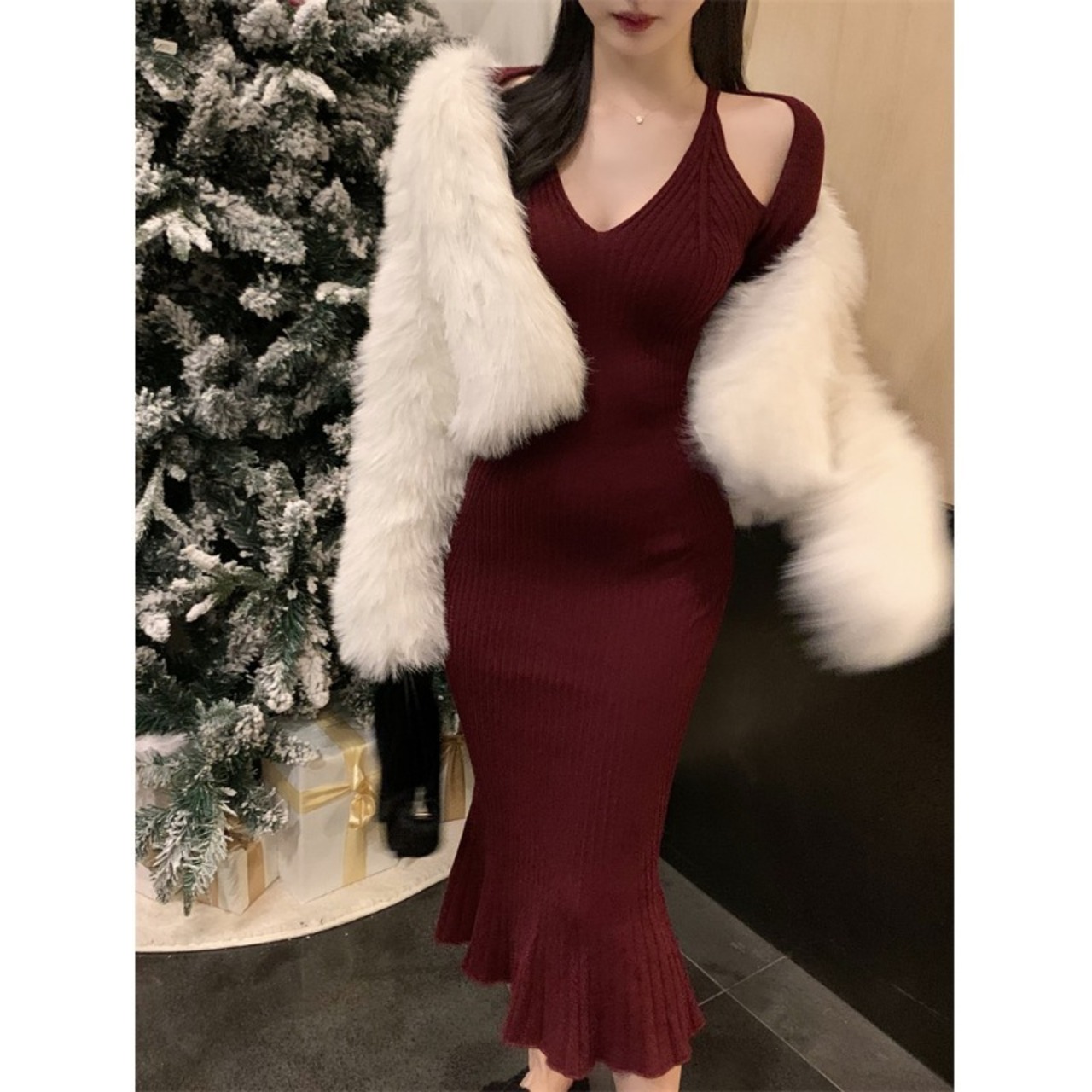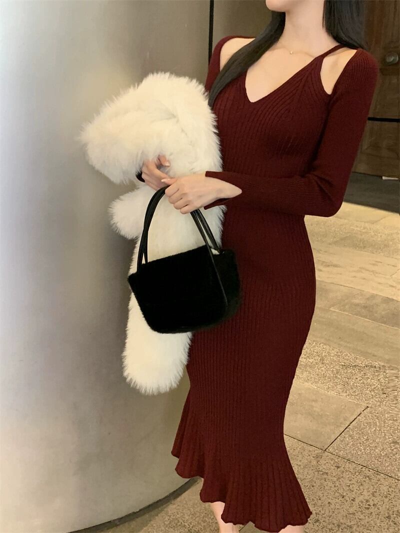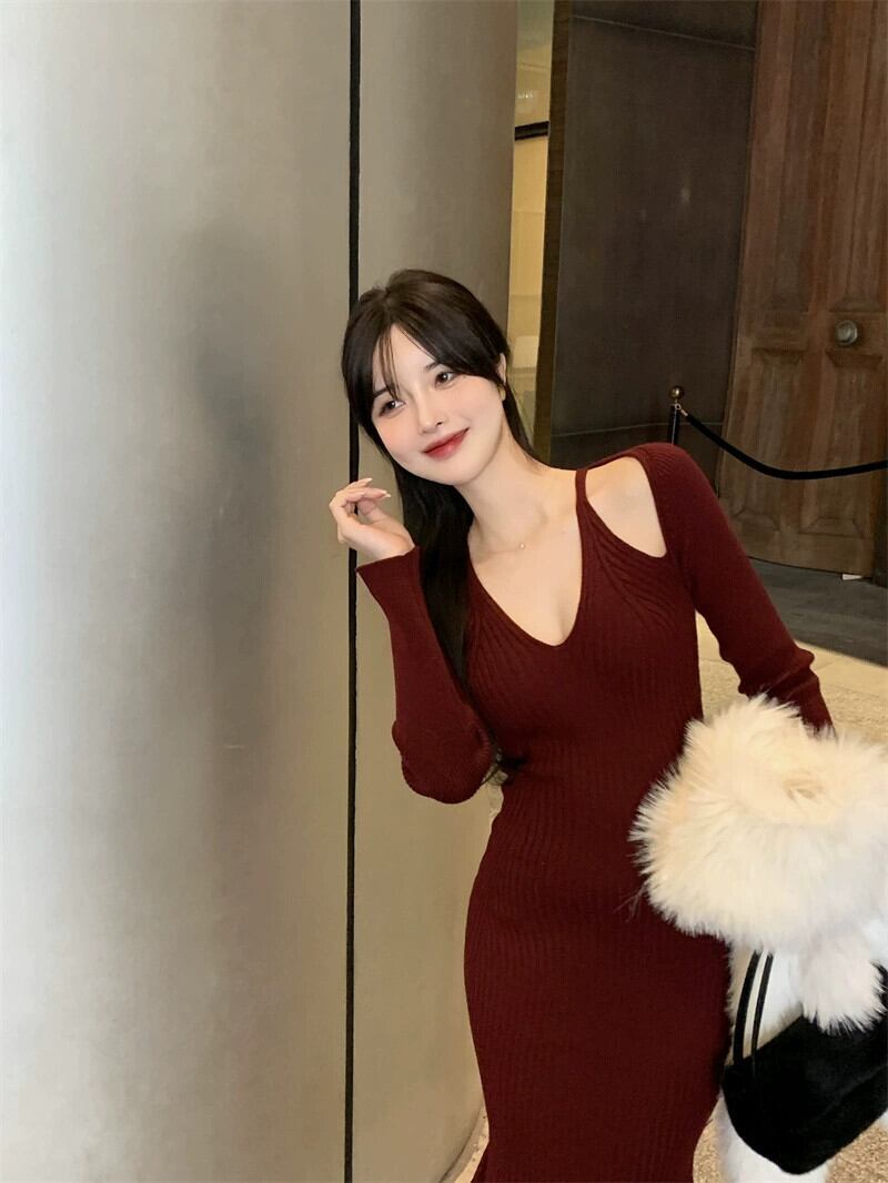 純粋な欲望スタイル長袖ニットドレス女性の春と秋スリムウエストセクシーな気質ミッドレングスフィッシュテールバッグヒップスカート ロング スプリング 春物 オータム 秋物 0921945732282474