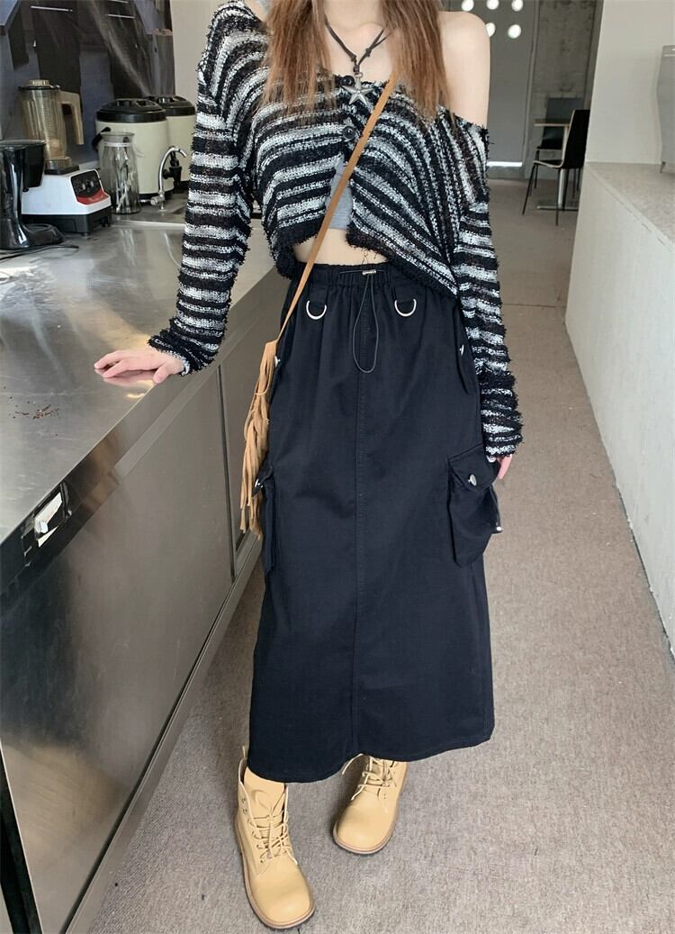 レトロなデザインのポケットツーリングスカート女性 2023 春の新バージョンルーズスリムミドル丈スカート スプリング 春物 0921945779666182