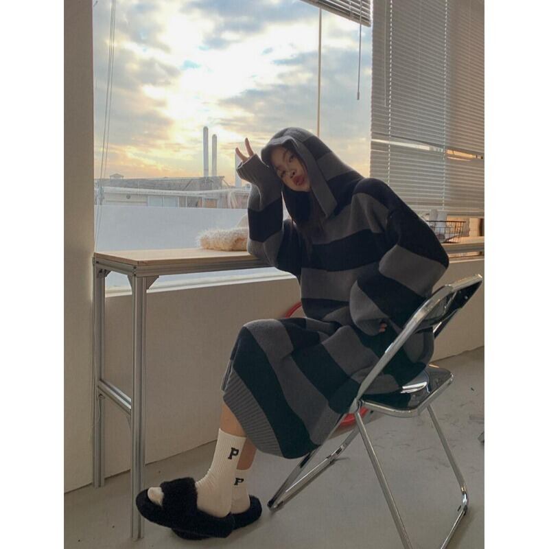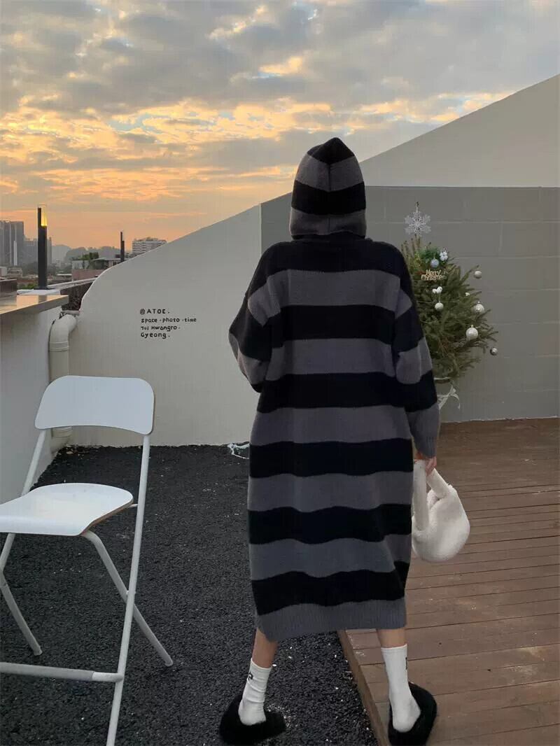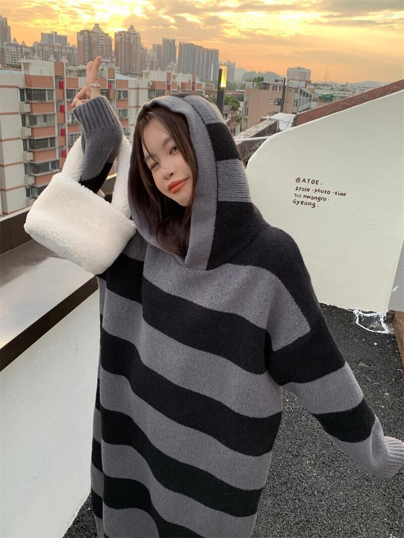 怠惰なスタイルのルーズカラーコントラストストライプロングフード付き長袖ドレスの女性の春 2023 新しいニットセータードレス スプリング 春物 0921953837447701