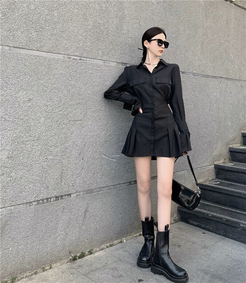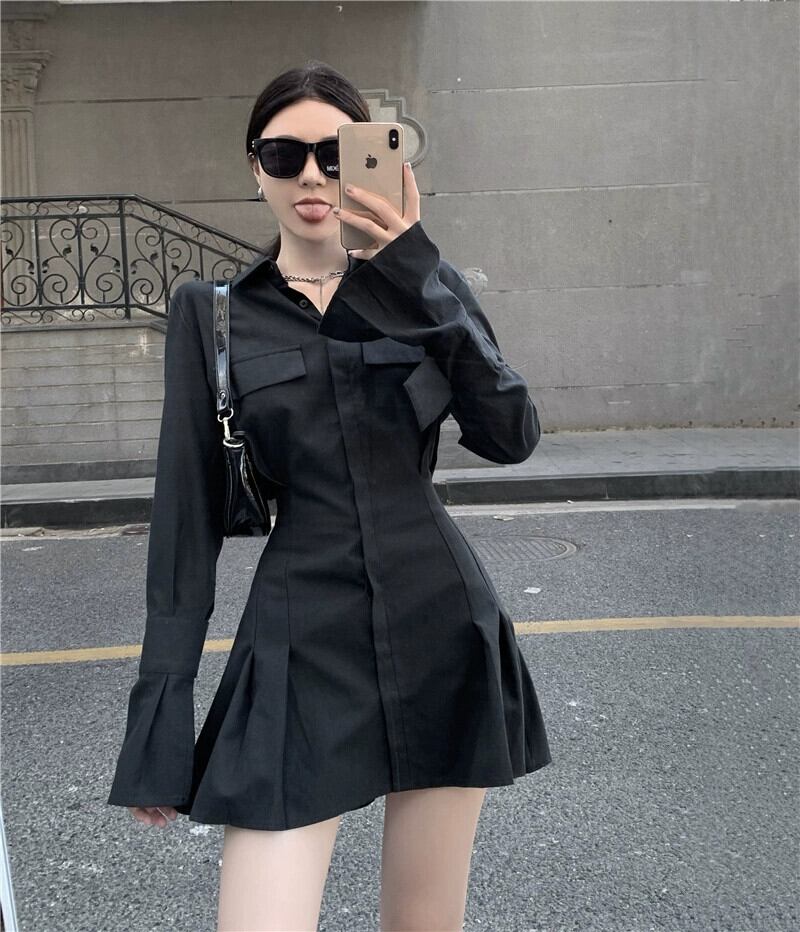スパイスシックな気質黒シャツドレス女性 2023 春の新しいハイエンドニッチウエスト A ラインスカート ブラック スプリング 春物 Aライン 09219664328505