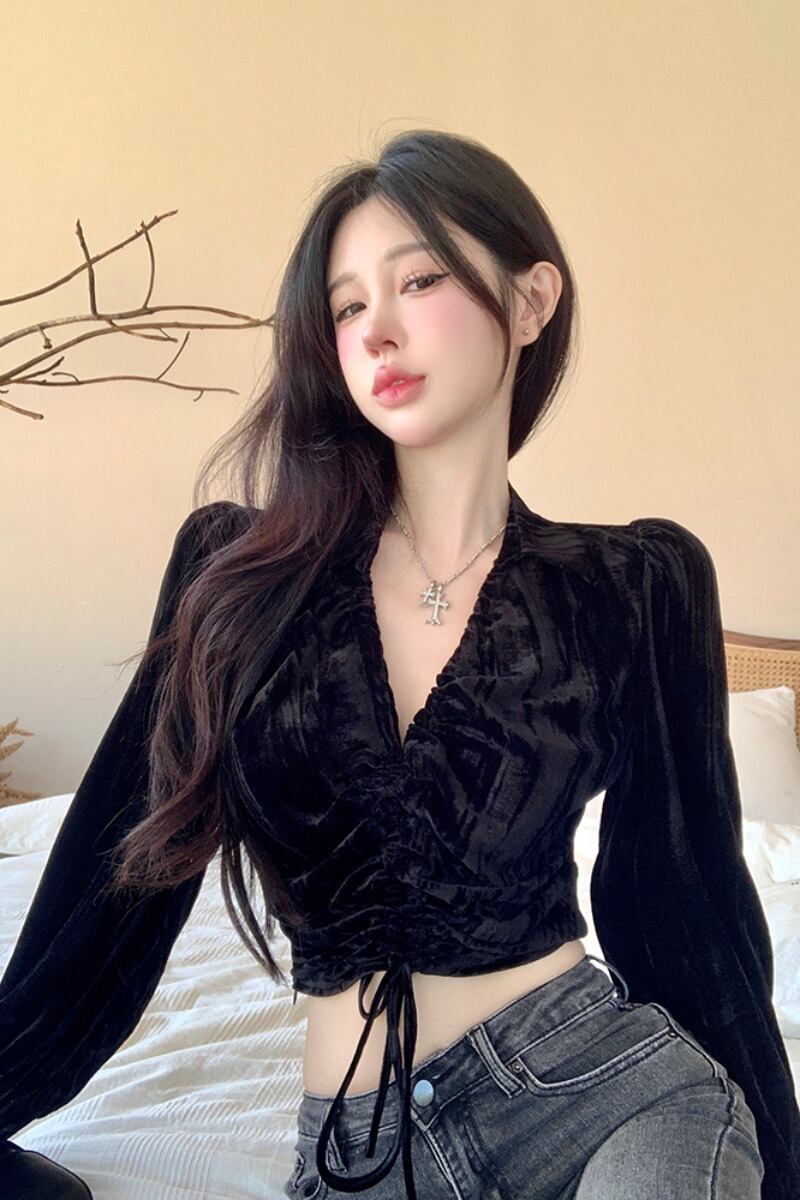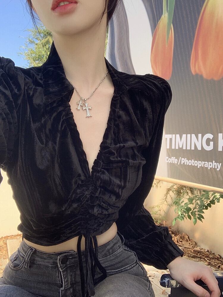 レトロセクシーな巾着 V ネック長袖シャツ女性の夏の 2023 新しいスタイルの気質スリムスリムゴールドベルベットトップ ロング サマー 夏物 Vネック 0921972017772909