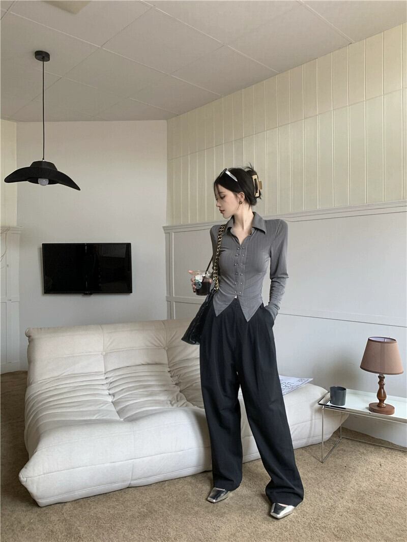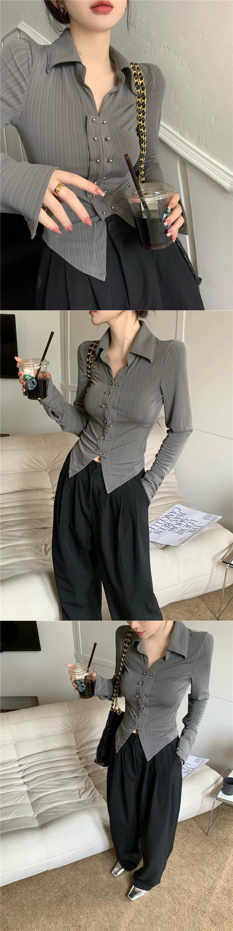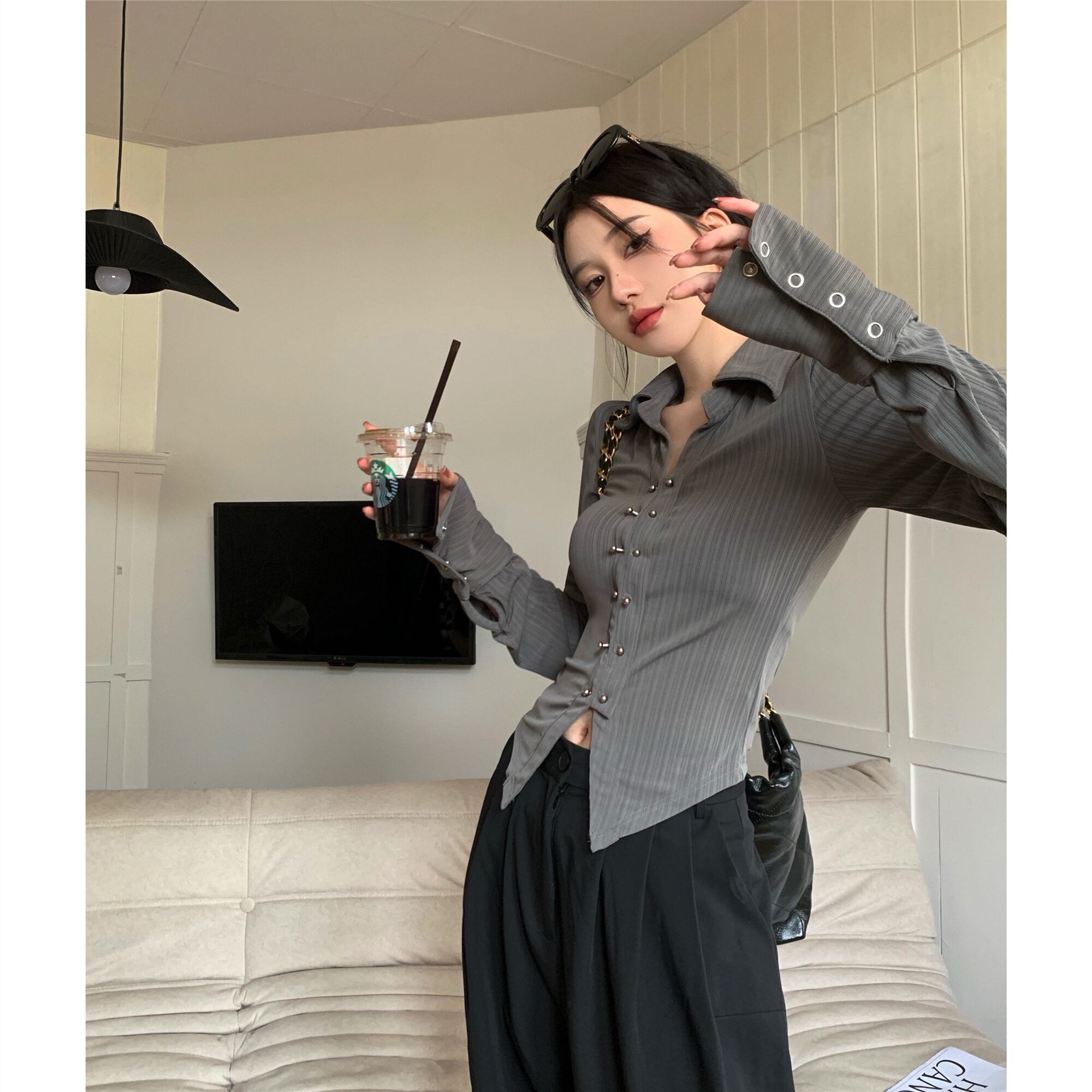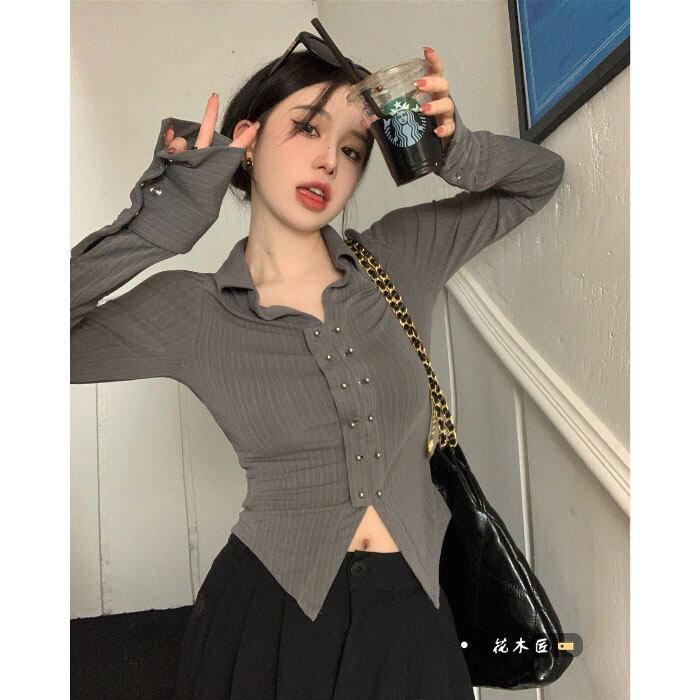 オールマッチバージョンのポロカラー Tシャツレディース 2023 春の新デザインセンスニッチスリムグレー長袖トップ ロング スプリング 春物 0921956878381510