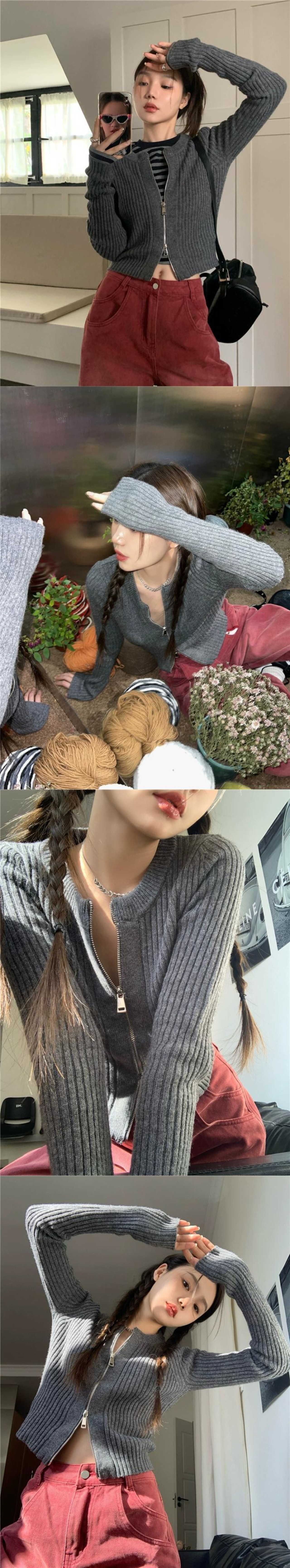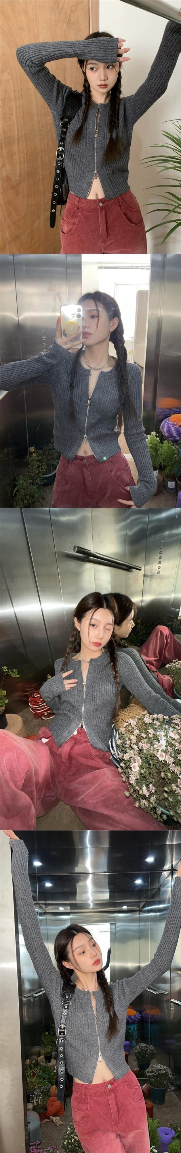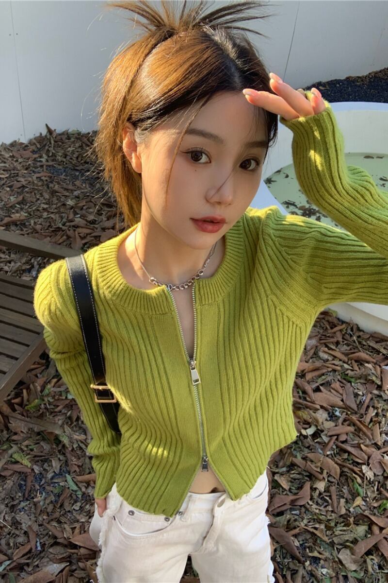 多彩なデザインのダブルヘッド ジッパー ニット カーディガン レディース 2023 春の新作ラウンド ネック無地長袖セーター ジャケット ロング スプリング 春物 Oネック ソリッドカラー 0921947891885917