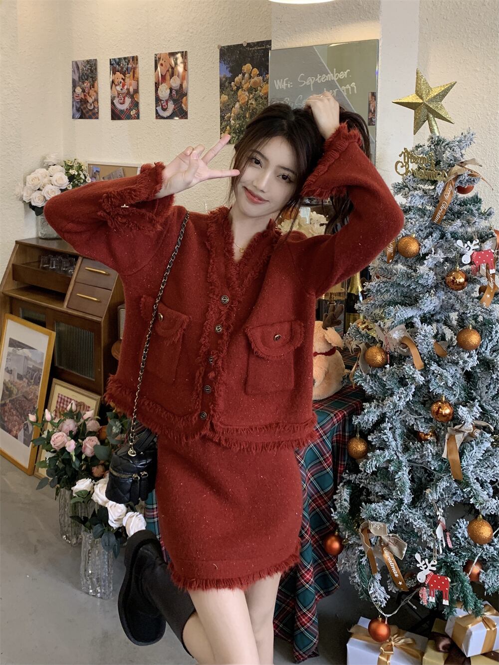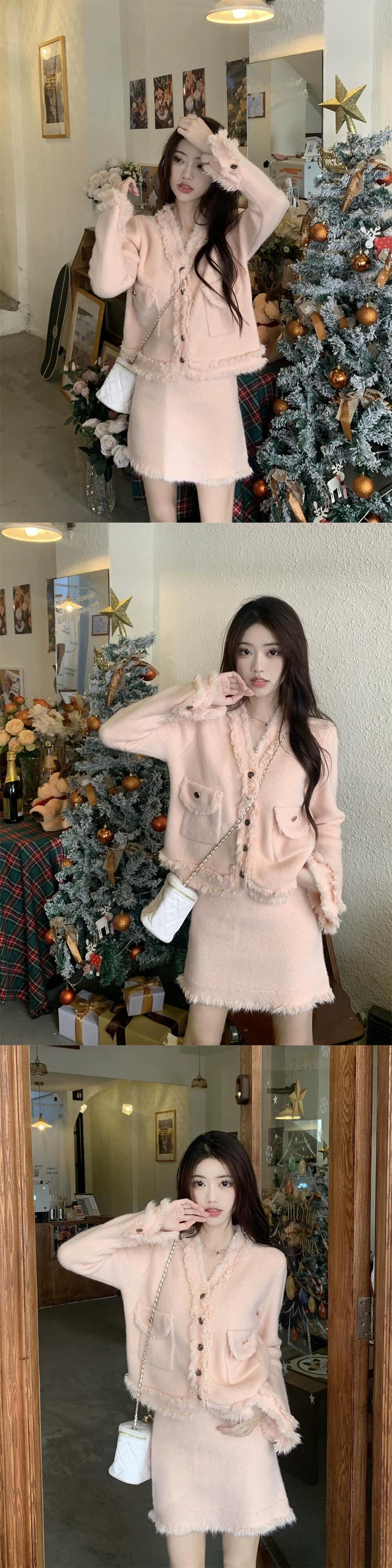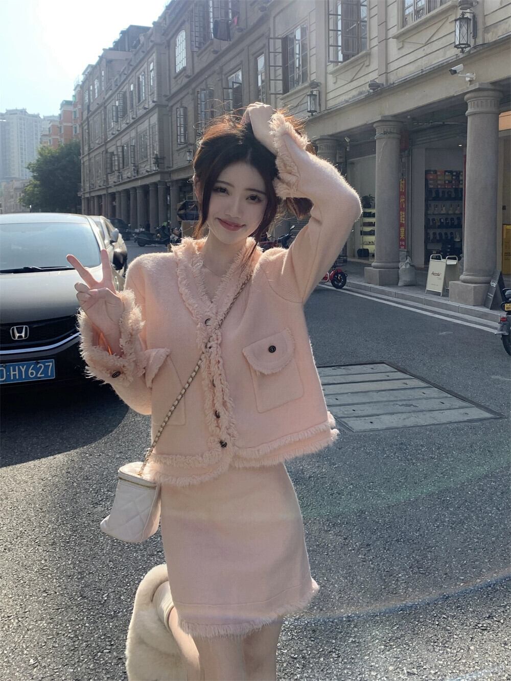 小香風短い気質 V ネックニットカーディガンセーターレディース春の新作スーツバッグヒップスカート 2 点セット ショート スプリング 春物 Vネック 0921973460267850