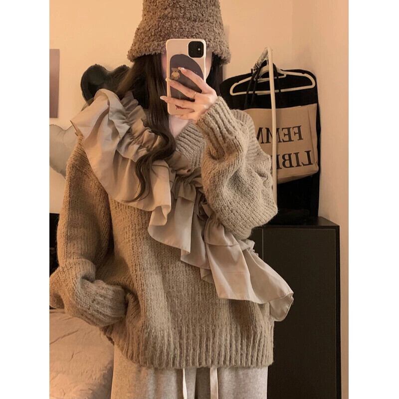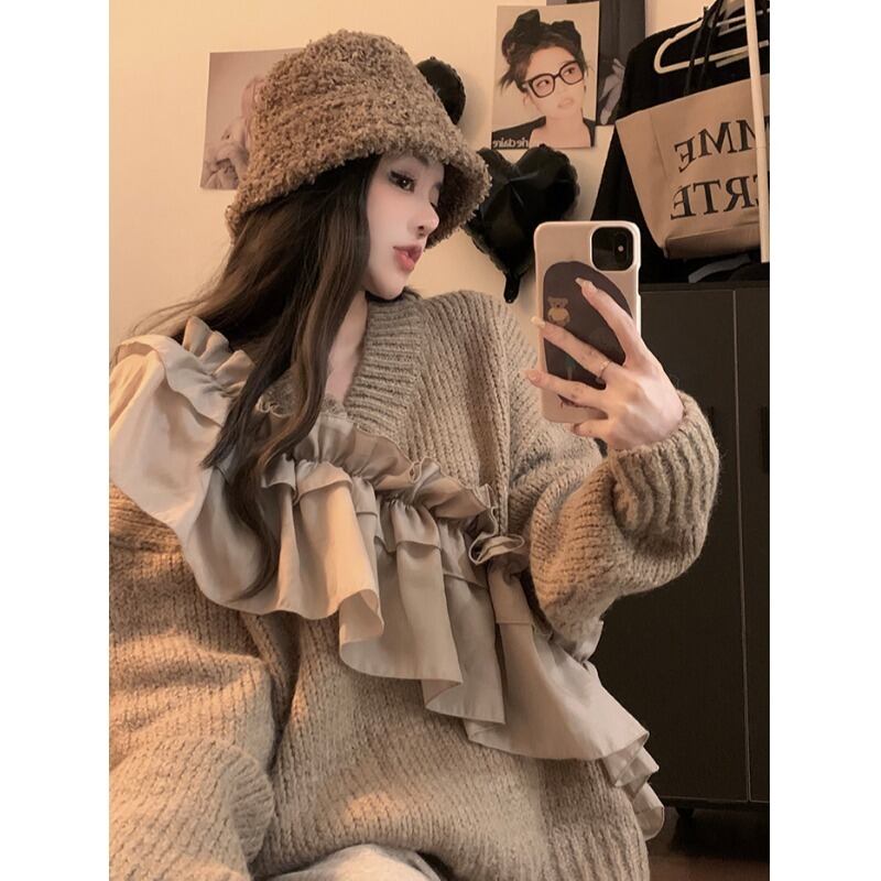 怠惰なスタイルのデザインセンスレース V ネックプルオーバーセーター女性の春と秋の 2023 新しいルーズで薄い長袖セーター ロング スプリング 春物 オータム 秋物 Vネック 0921982515683812