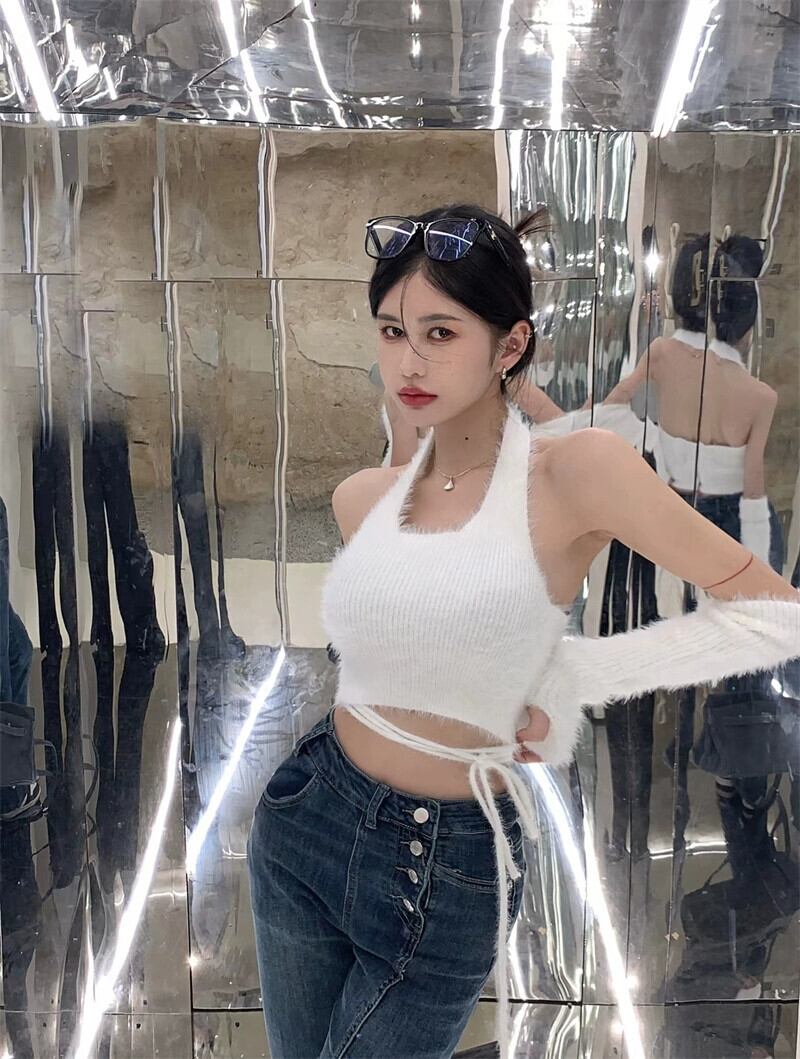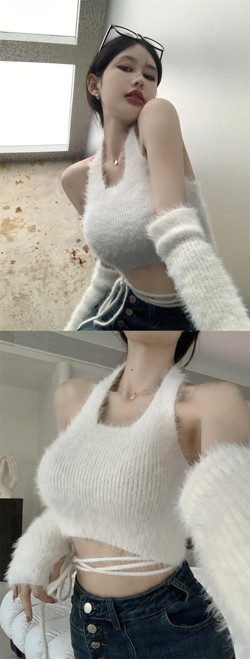 純粋な欲望セクシーな背中の開いたイミテーションミンクベルベットホルターネックセーターベスト女性の春 2023 シックなニットトップ スプリング 春物 092194457729882