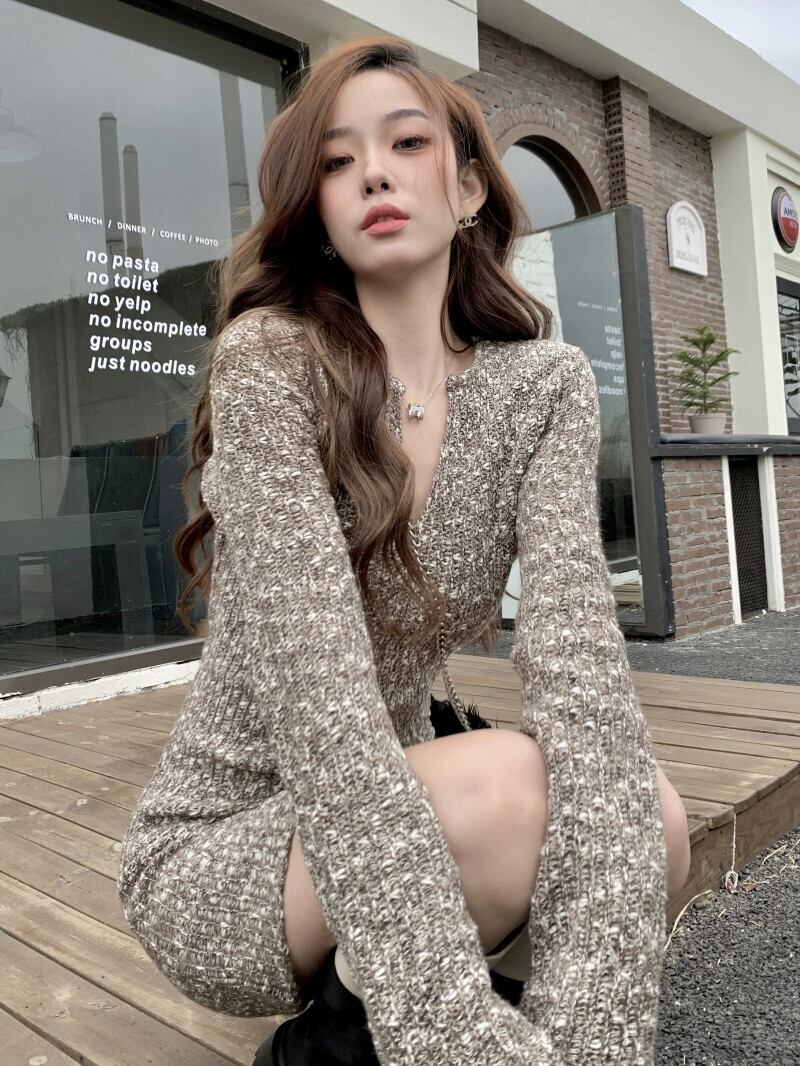 スパイス V ネック長袖ニットドレス女性の冬の 2023 新しいインナーボトニングスカートスリムフィットヒップスカート ロング ウィンター 冬物 Vネック 0921992230512631